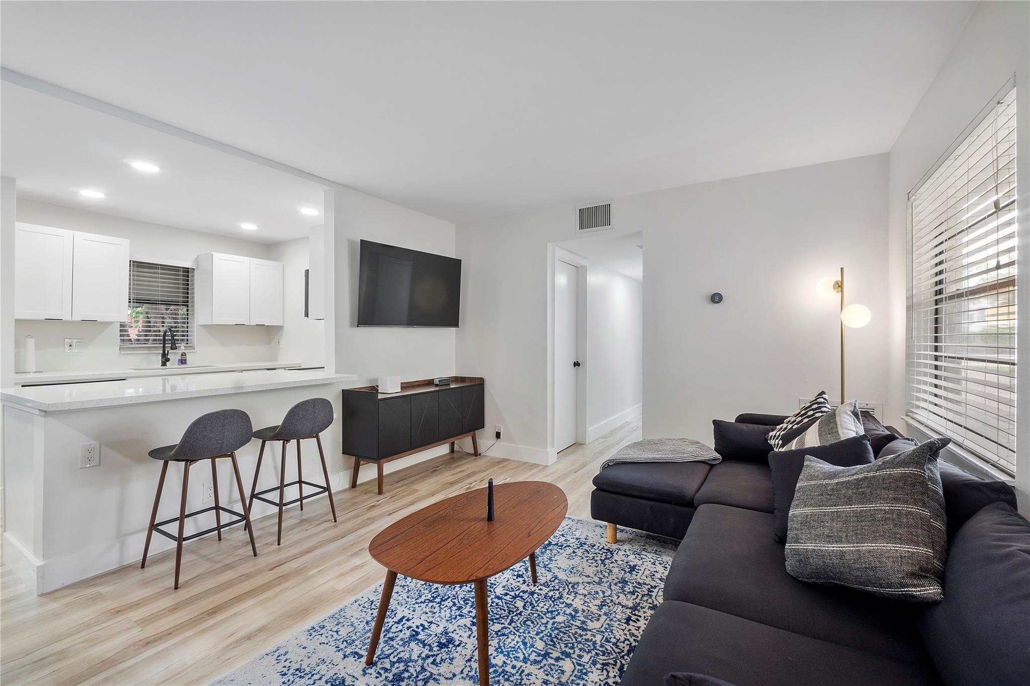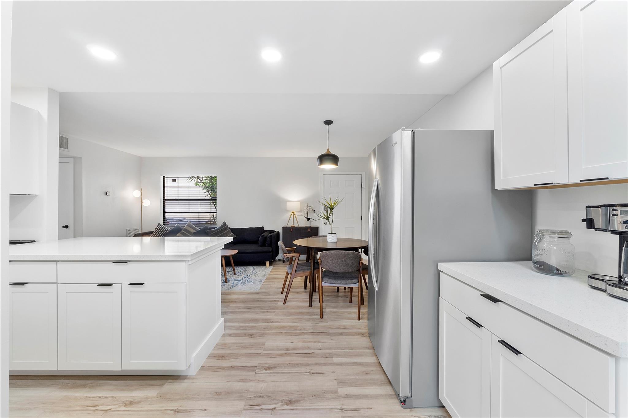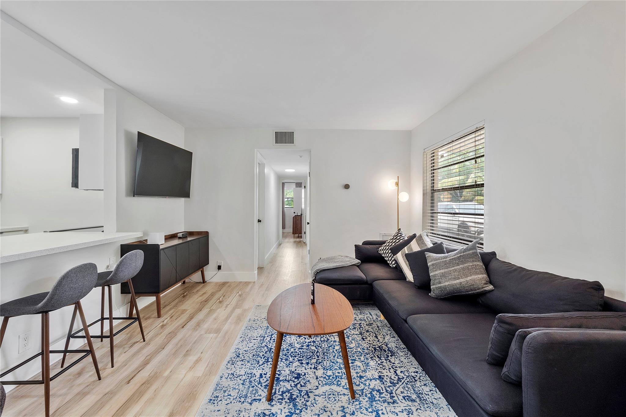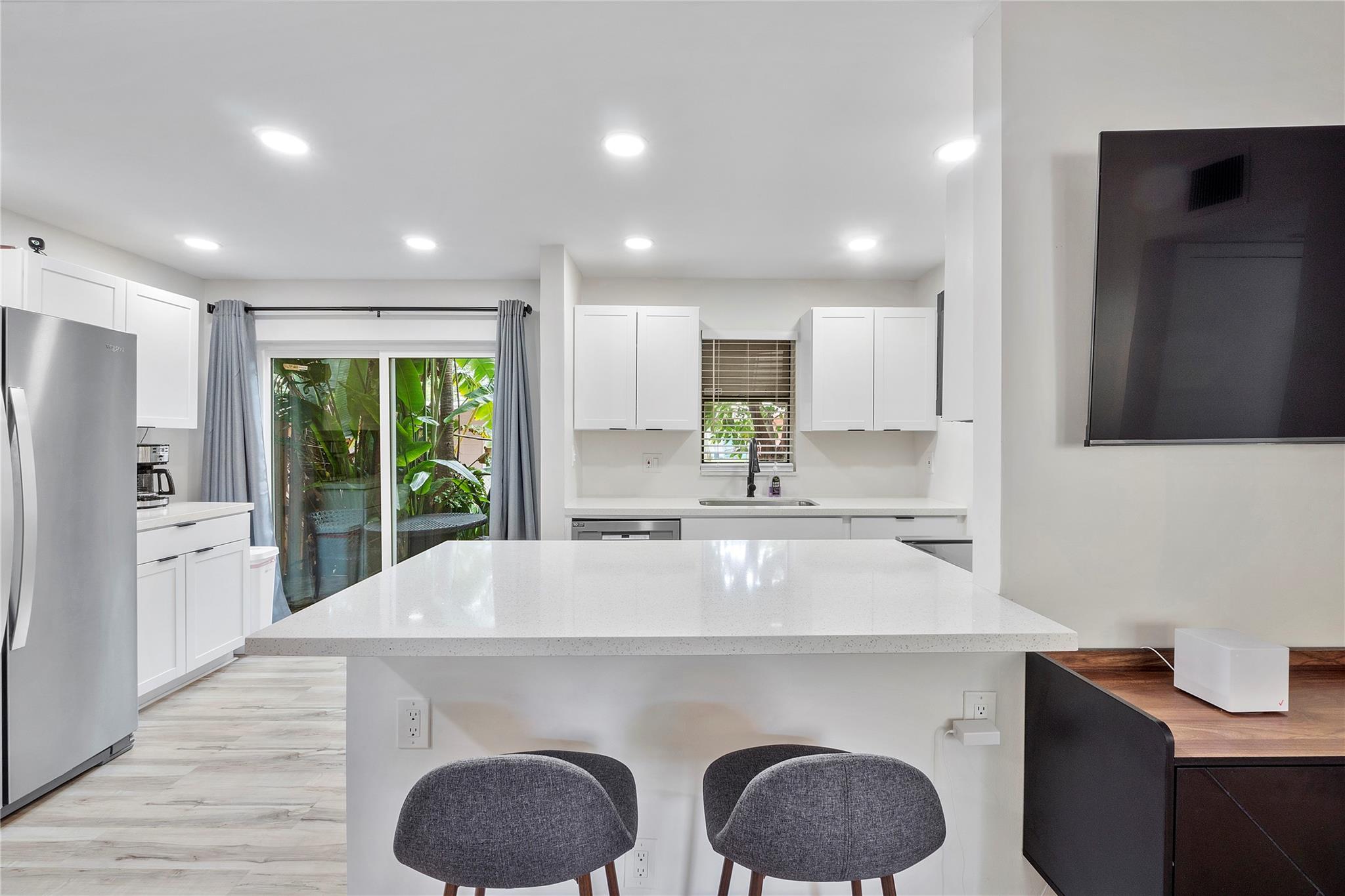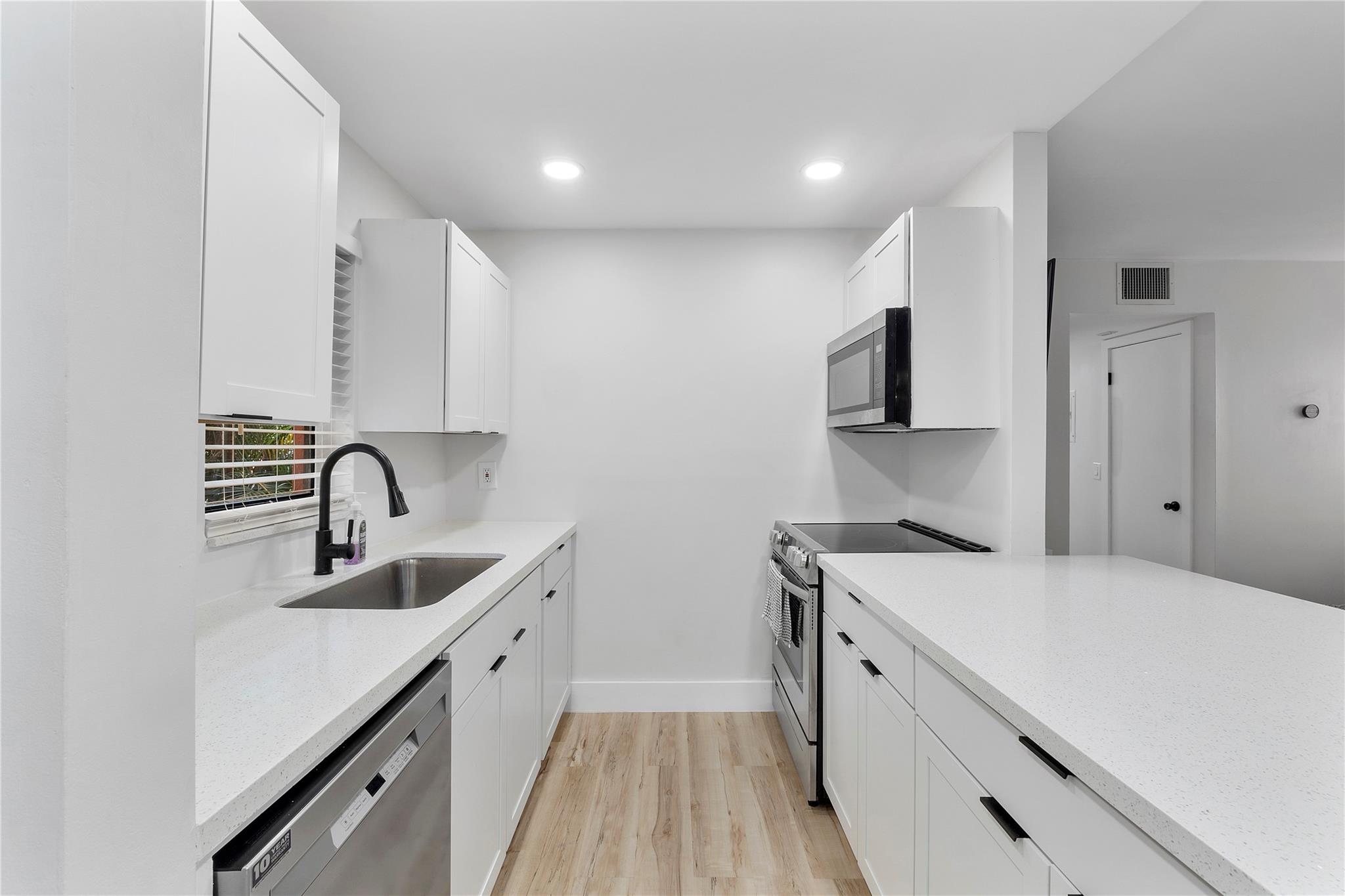 Beautiful corner unit with 2B/2B FULL RENOVATED offers the perfect balance with modern taste and peaceful retreat. Investors are welcome since unit is allowed to RENT RIGHT AWAY. Open concept kitchen with bright quartz countertop, white wood cabinetry and new appliances to entertain family & friends. The primary bedroom is generously sized to fit a king size bed. The attached en-suite bathroom includes quartz countertop & modern fixtures. The additional bedroom is spacious too, making it ideal for a variety of uses. The guest bathroom is nicely updated. WASHER/DRYER COMBO INSIDE THE UNIT. AC is 2023, Roof 2022. The building features an oversized pool, waterfront access for kayak & paddleboard, and private patio. Assessments paid off for exterior painting & new pool deck. PET FRIENDLY