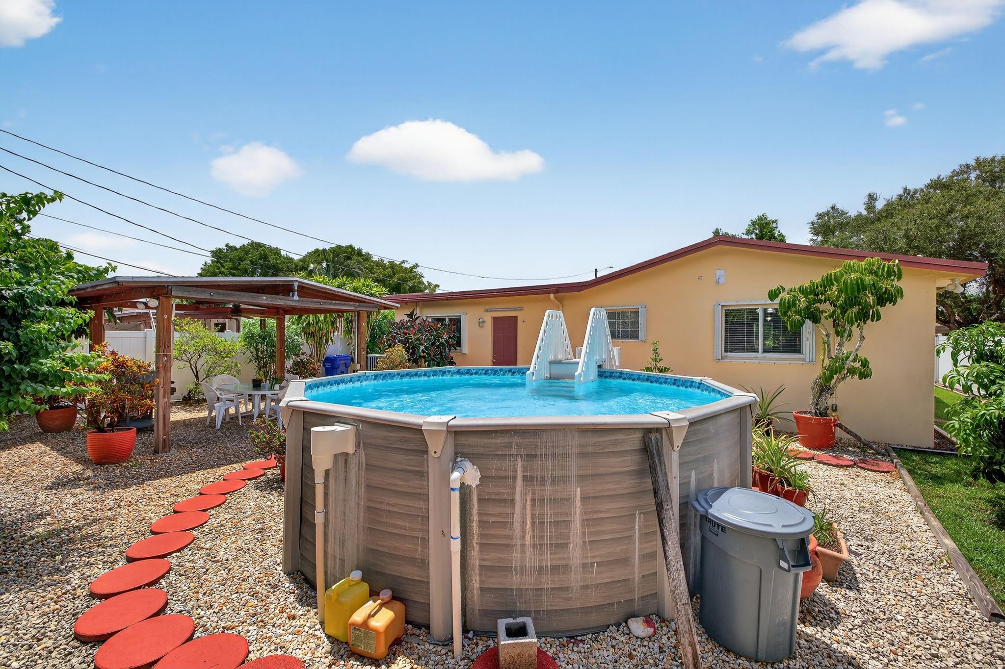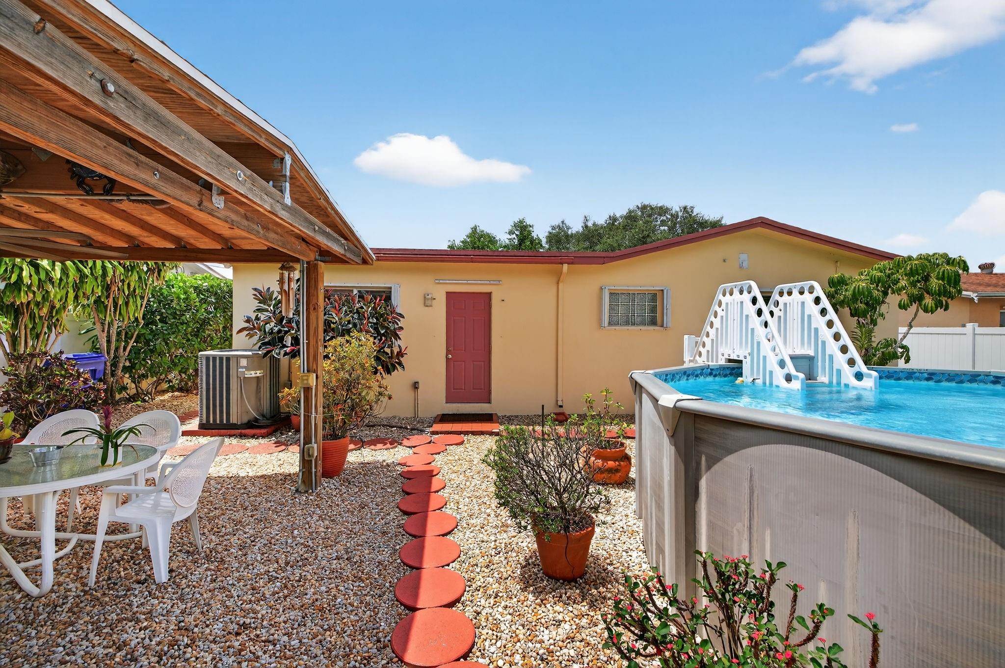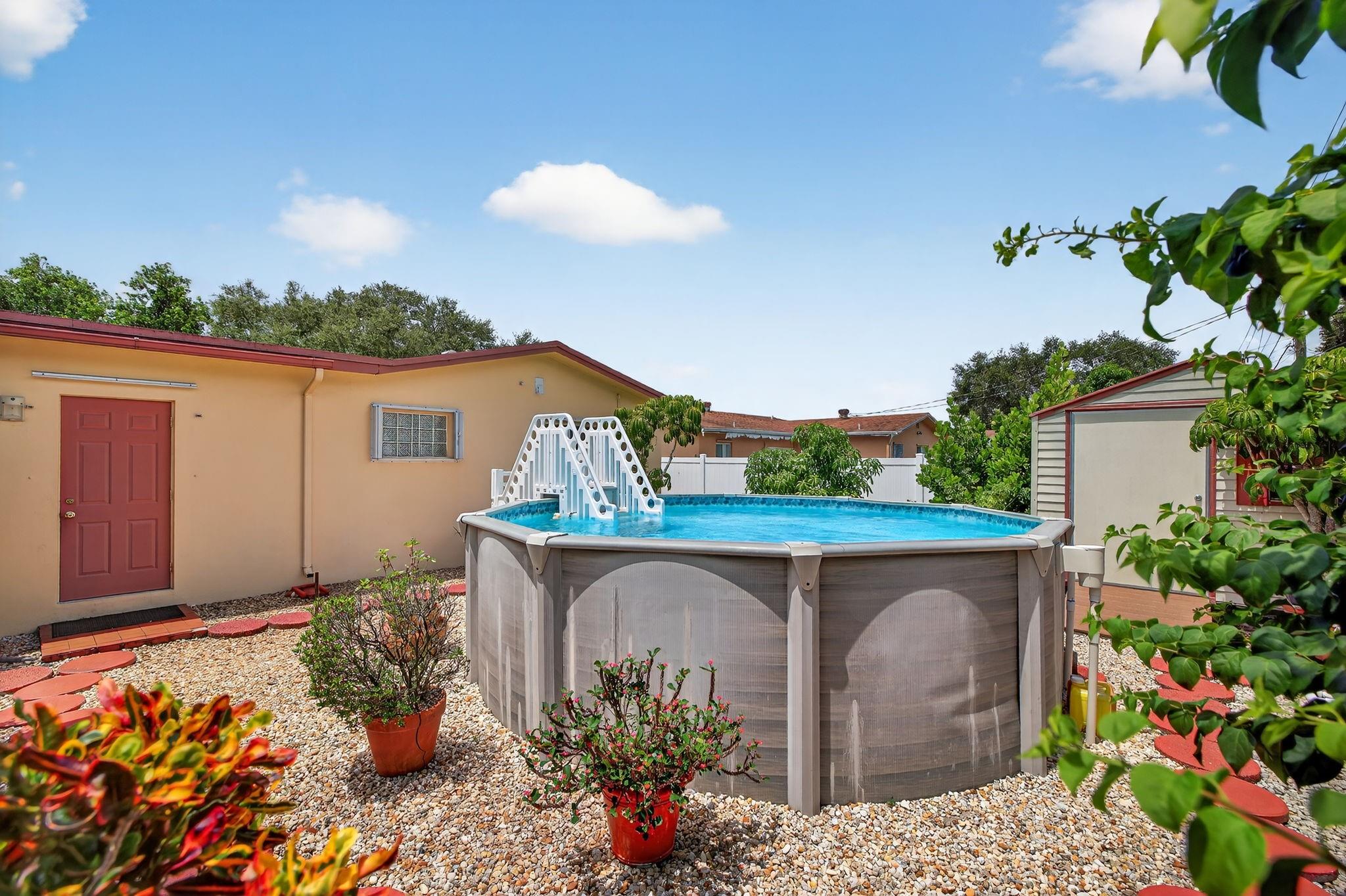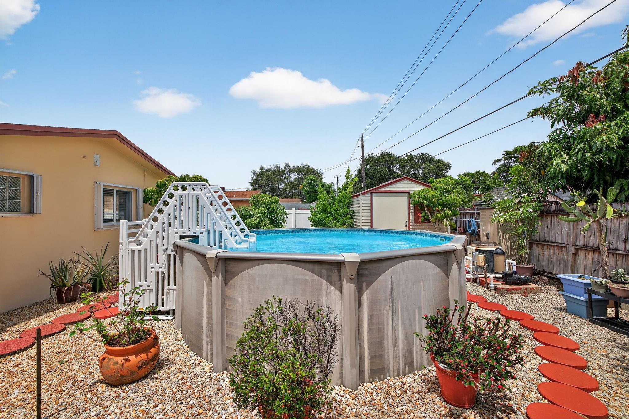 Spacious single-family home with 3 bedrooms, 2 bathrooms PLUS an office. Impact windows on the front & accordion shutters on the rest. Diagonal tile flooring throughout, creating a cohesive flow. Remodeled kitchen with SS appliances, granite counter tops, ample cabinet space. Laundry/Utility room next to kitchen. Enjoy additional living space with the 240 sq ft permitted family room, ideal for relaxing or fitness area. Step outside to a large fenced yard, with an above ground pool, covered gazebo with ceiling fan, and a tool shed with power – For projects or storage. Plenty of yard space for entertaining or for pets. Located close to shops, parks, major highways, this home combines comfort and functionality. Don’t miss out on this opportunity to own a home with so much to offer!
