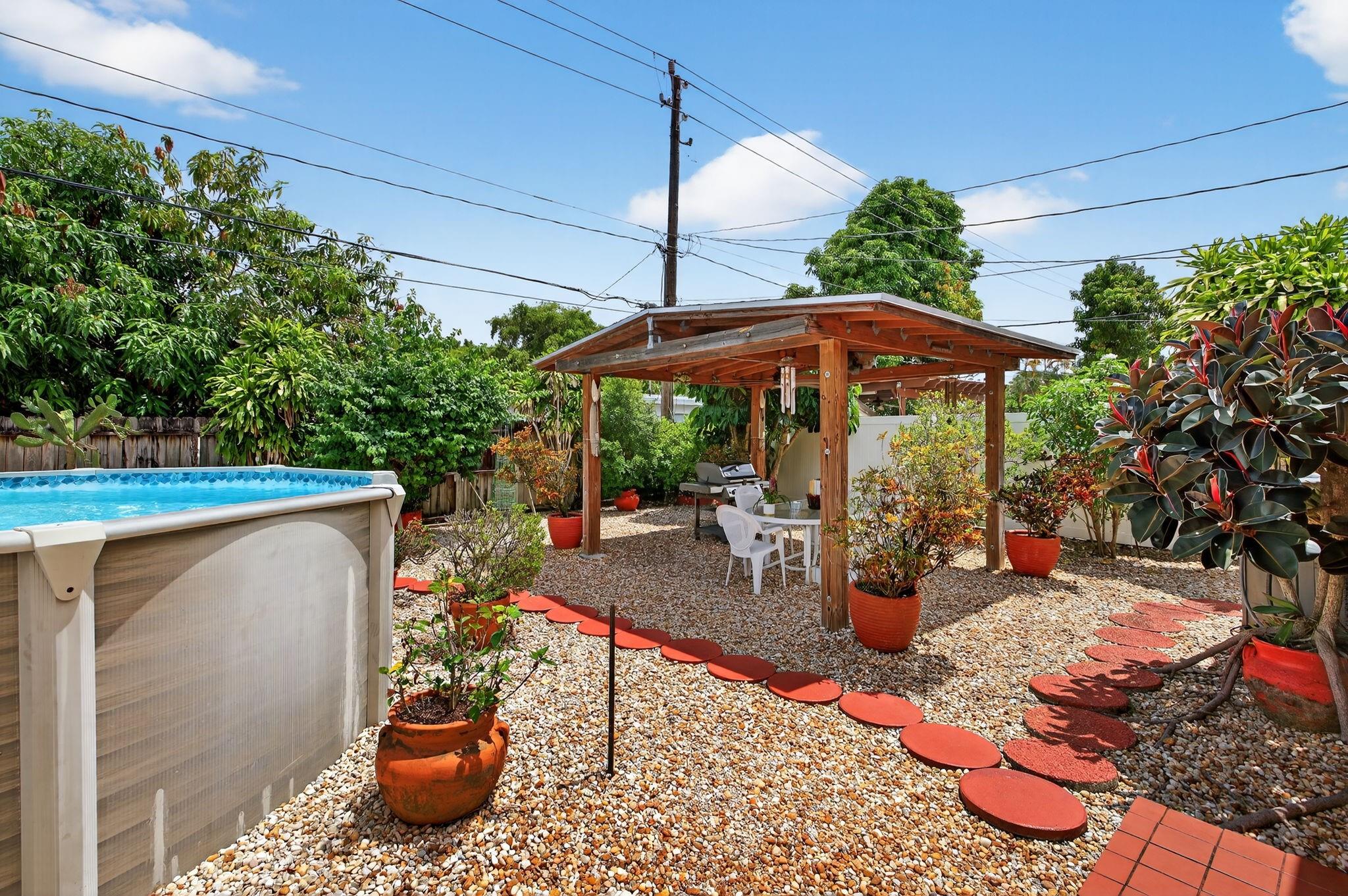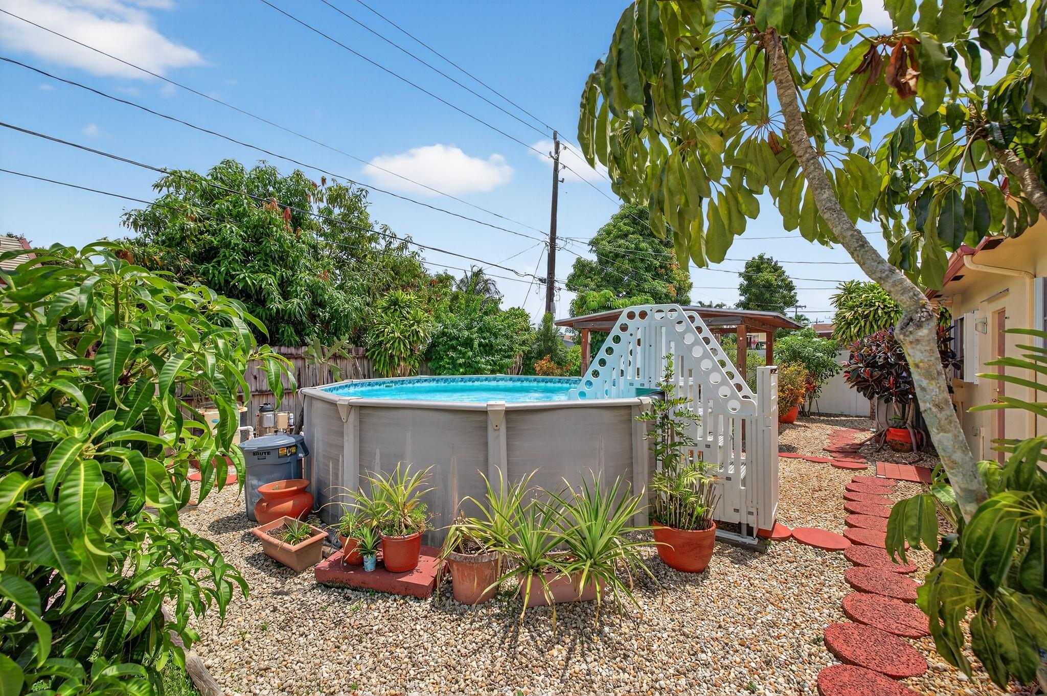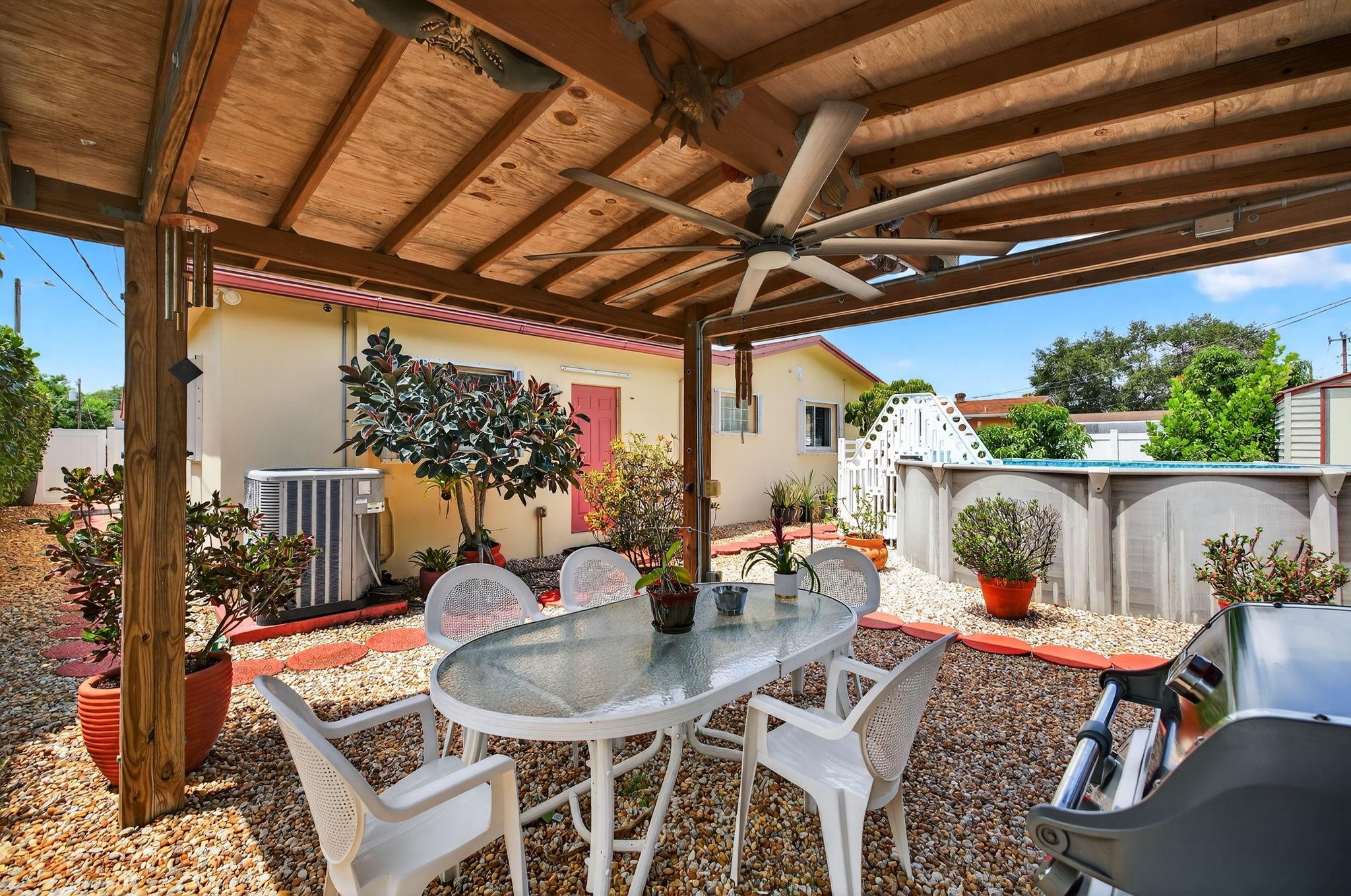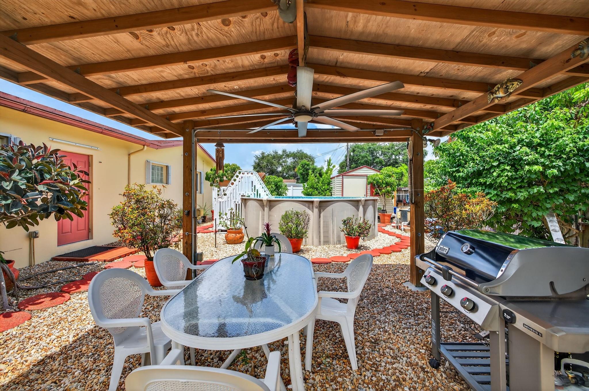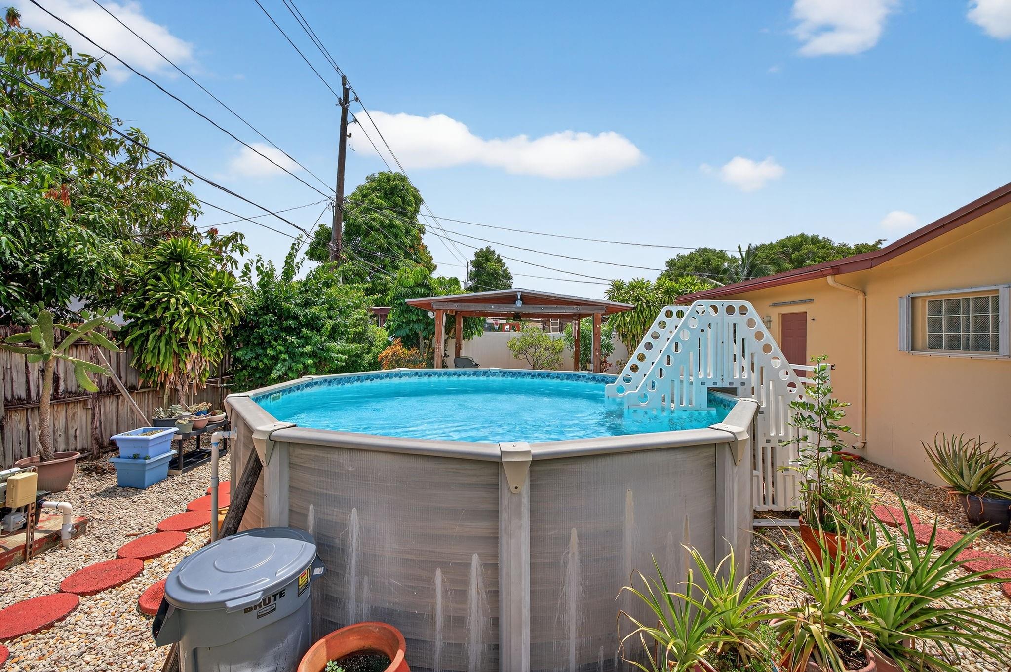 Spacious single-family home with 3 bedrooms, 2 bathrooms PLUS an office. Impact windows on the front & accordion shutters on the rest. Diagonal tile flooring throughout, creating a cohesive flow. Remodeled kitchen with SS appliances, granite counter tops, ample cabinet space. Laundry/Utility room next to kitchen. Enjoy additional living space with the 240 sq ft permitted family room, ideal for relaxing or fitness area. Step outside to a large fenced yard, with an above ground pool, covered gazebo with ceiling fan, and a tool shed with power – For projects or storage. Plenty of yard space for entertaining or for pets. Located close to shops, parks, major highways, this home combines comfort and functionality. Don’t miss out on this opportunity to own a home with so much to offer!