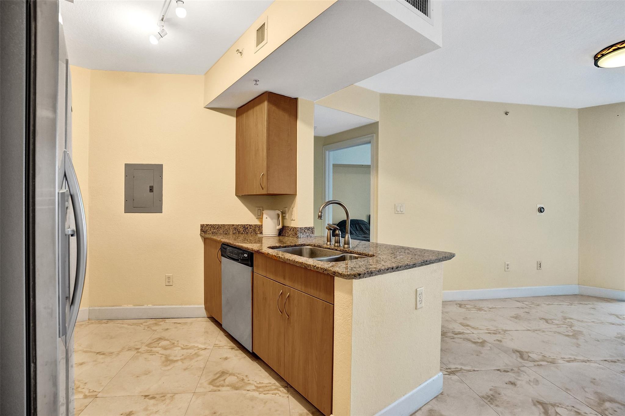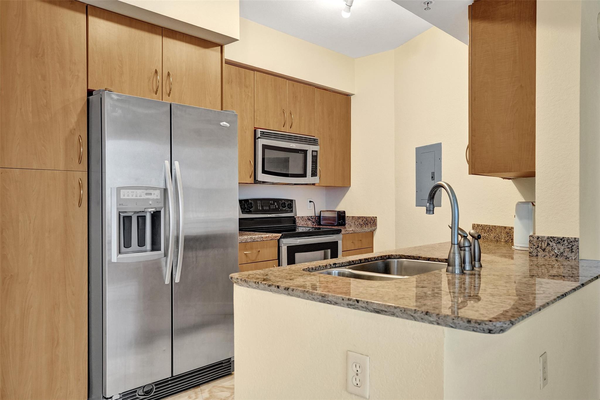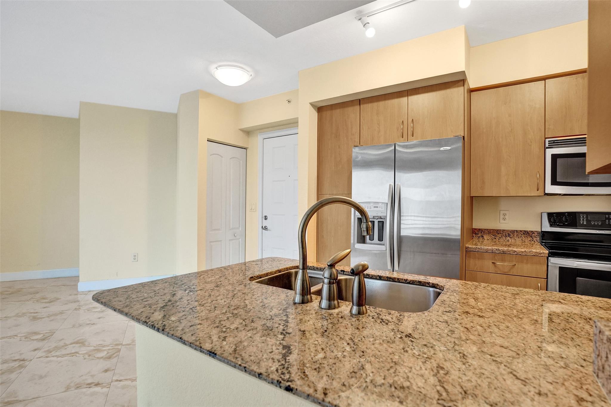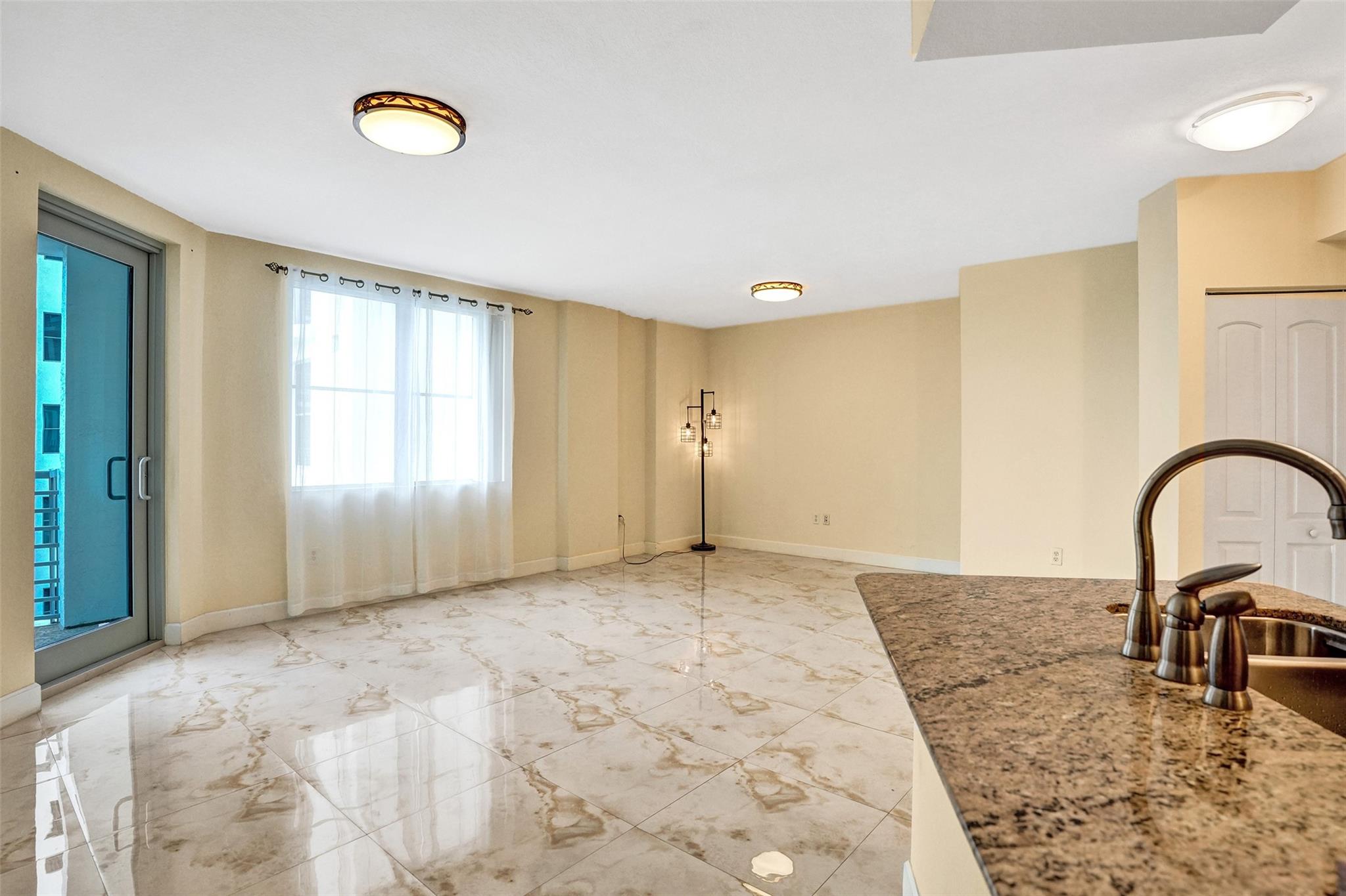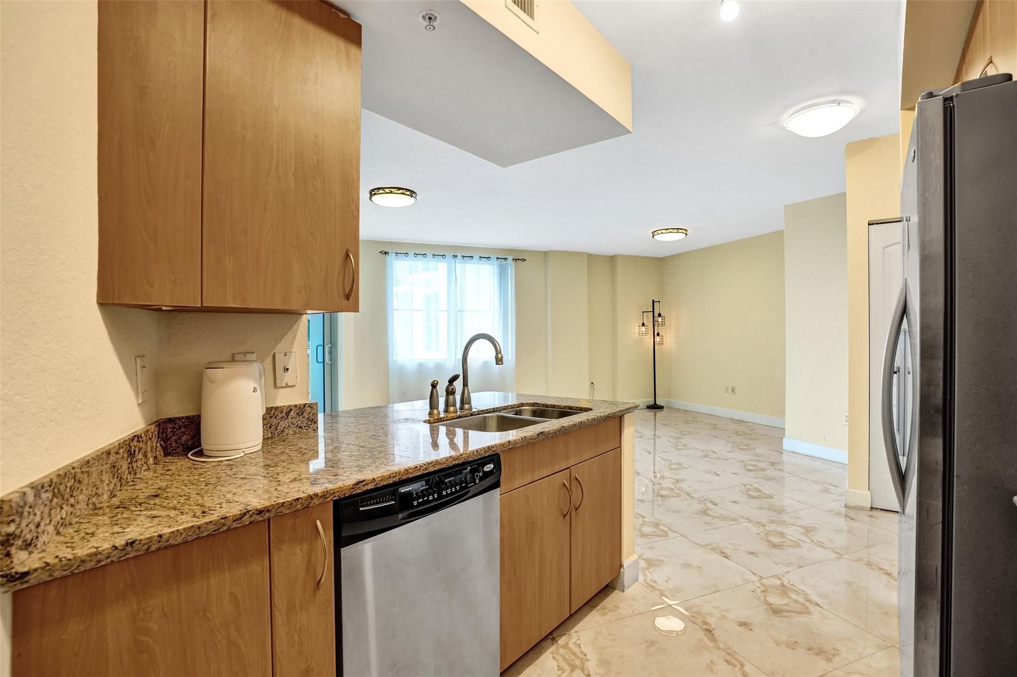 Beautiful 1BR/1BA 815 sq ft condo on 10th floor, centered in the middle of downtown Hollywood's hottest redevelopment area. Gorgeous porcelain floors throughout. Open flr plan, w/granite counters & ss appliances in kitchen. Spacious BR & liv. area w/dual entrance to balcony. Impact windows & doors. Oversized bath w/sep shower & soaking tub. Large walk-in closet. Washer & dryer inside unit. Pet friendly building. Amenities include movie theatre, newly renovated rooftop pool area, party room, 24/7 security, business office, sauna, gym/pilates & game room. Valet or self parking in attached elevated garage. Walk to Artspark, restaurants & nightlife, Publix & Post Office. Within minutes drive to award winning tropical Hollywood beach, FLL airport & Hard Rock. Well maintained bldg. Ok to lease.