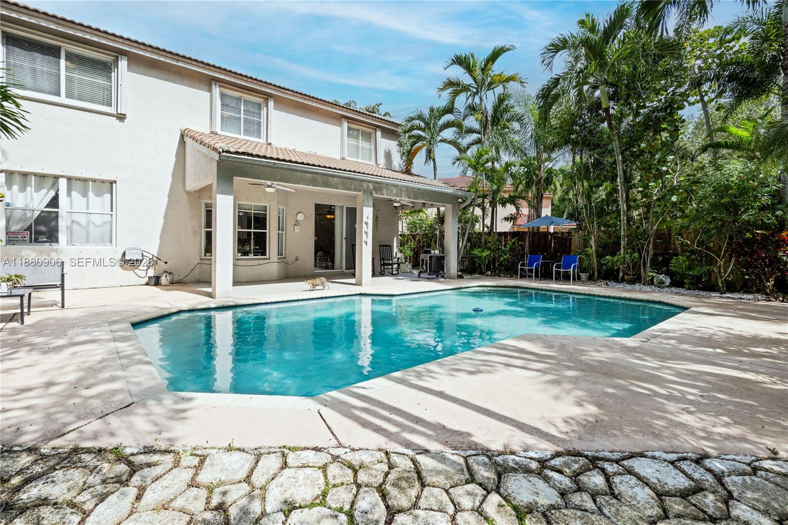 Welcome to this beautiful 2-story home featuring 4 bedrooms, 3 full baths, and 2,466 sq ft of living space. Located in the desirable gated community of Poinciana Parc, this residence sits on one of the largest lots in the neighborhood. Thoughtful layout 1 bedroom,1 full bath on the first floor, a versatile loft that can be enclosed as a 5th bedroom. The home is filled with volume ceilings and abundant natural light. Eat-in kitchen overlooks the sparkling pool and lush garden, offering a serene retreat for the nature lover. Step outside to your private backyard oasis, perfect for entertaining or simply relaxing. Convenient access to major highways, shopping, dining, and top-rated schools and a short drive to parks and outdoor recreation.