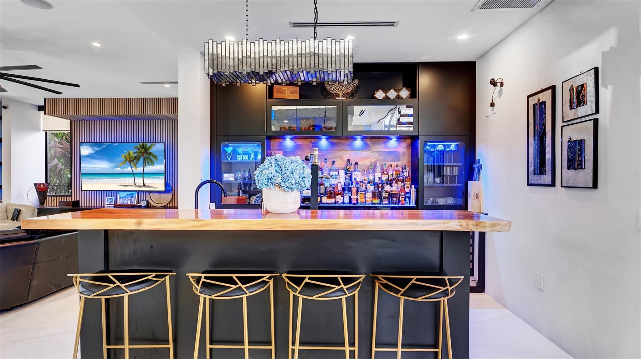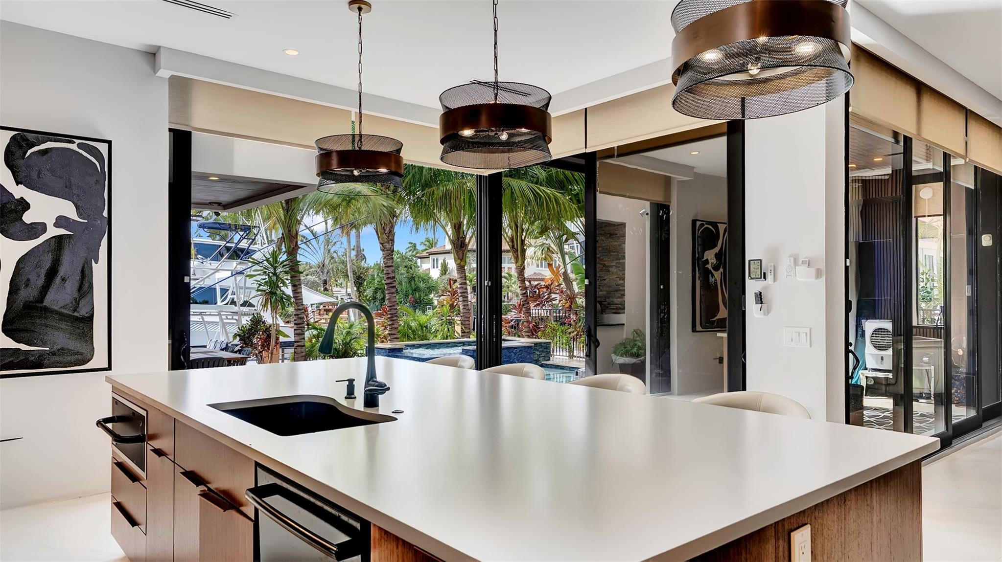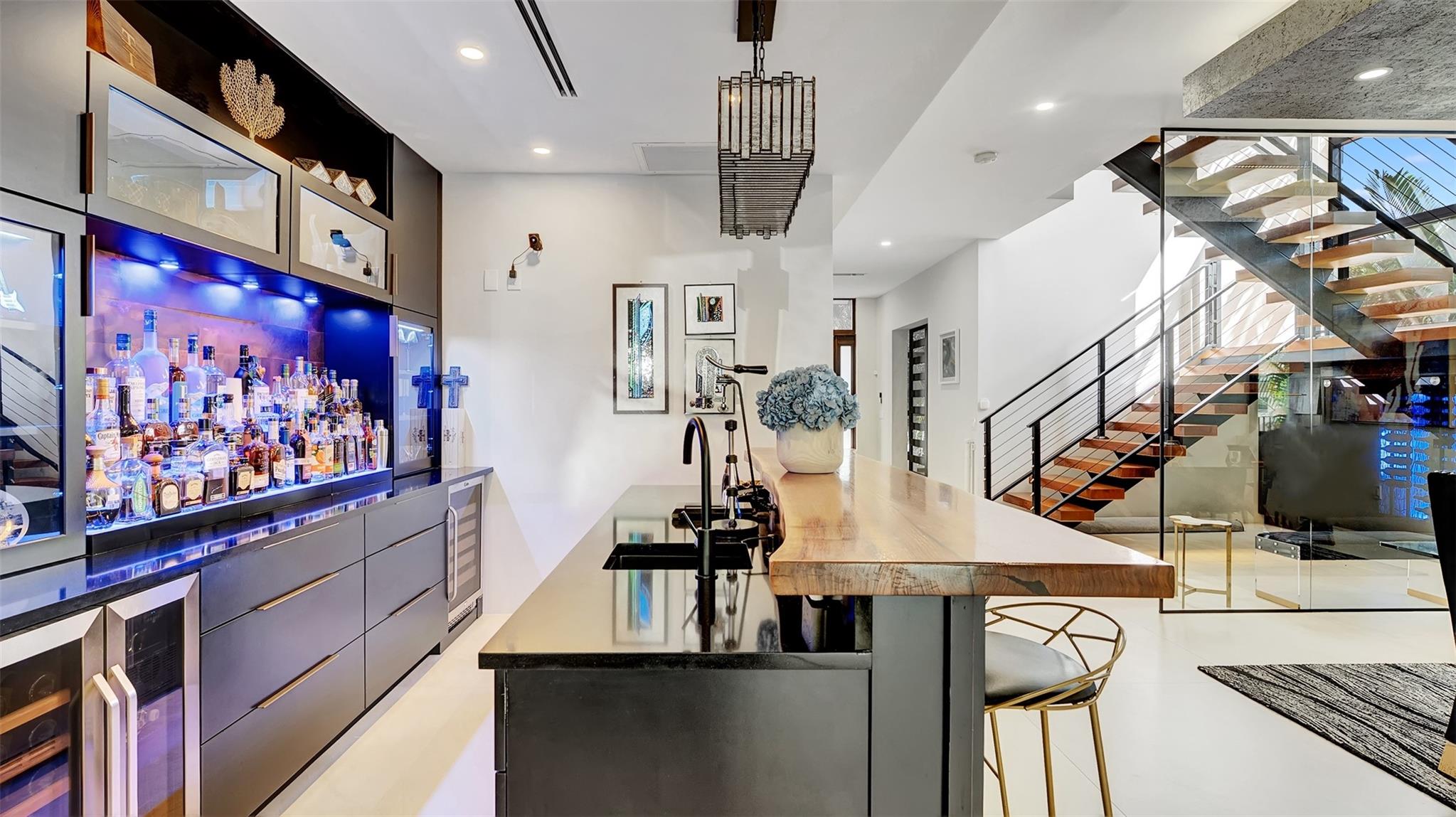Not your average home on the Las Olas Isles, behind the gates this custom 4-bed, 4.5-bath home spans 4,539 Sqft. Meticulous attention to detail and modern elegance helps define this home, which comes equipped with high-impact windows, 12 camera surveillance system, 48x48 porcelain tiles, quartz counters, 8.5 Tons of AC systems, low E windows with bronze tint a floating staircase over a 170-bottle wine cellar, a bar for entertaining, the kitchen has a huge island, 6 burner gas range that overlooks the family room that flows outside through the 11’ pocket sliders to a screened Lani. Outside you can entertain with your pizza oven & grill, pool and jacuzzi, the 50’ dock is well equipped with 30/50 amp. smart illumination by Lutron & Dals. Live luxuriously in this exquisite Idlewyld residence.