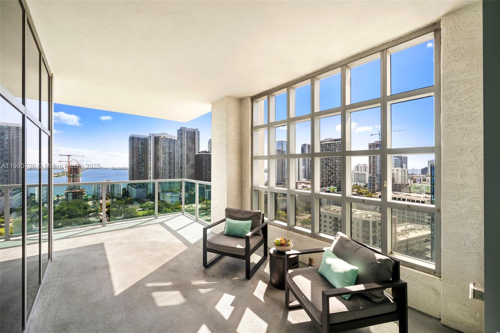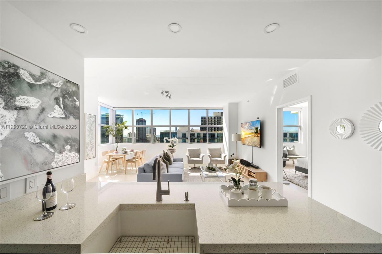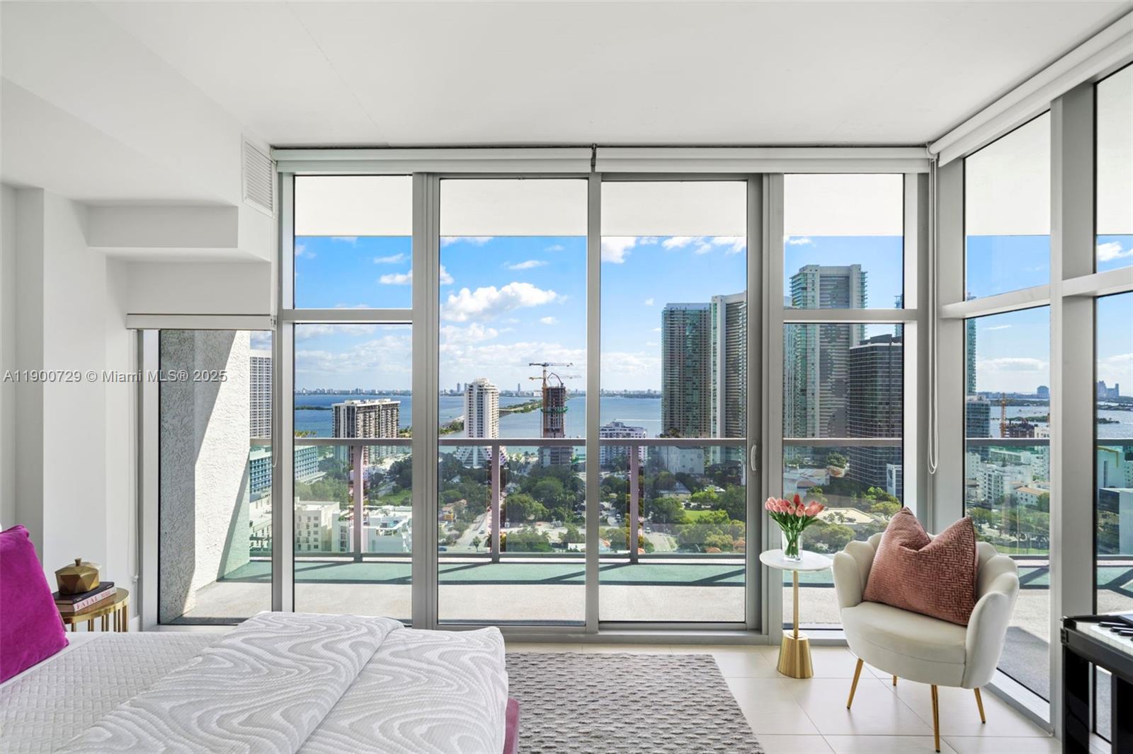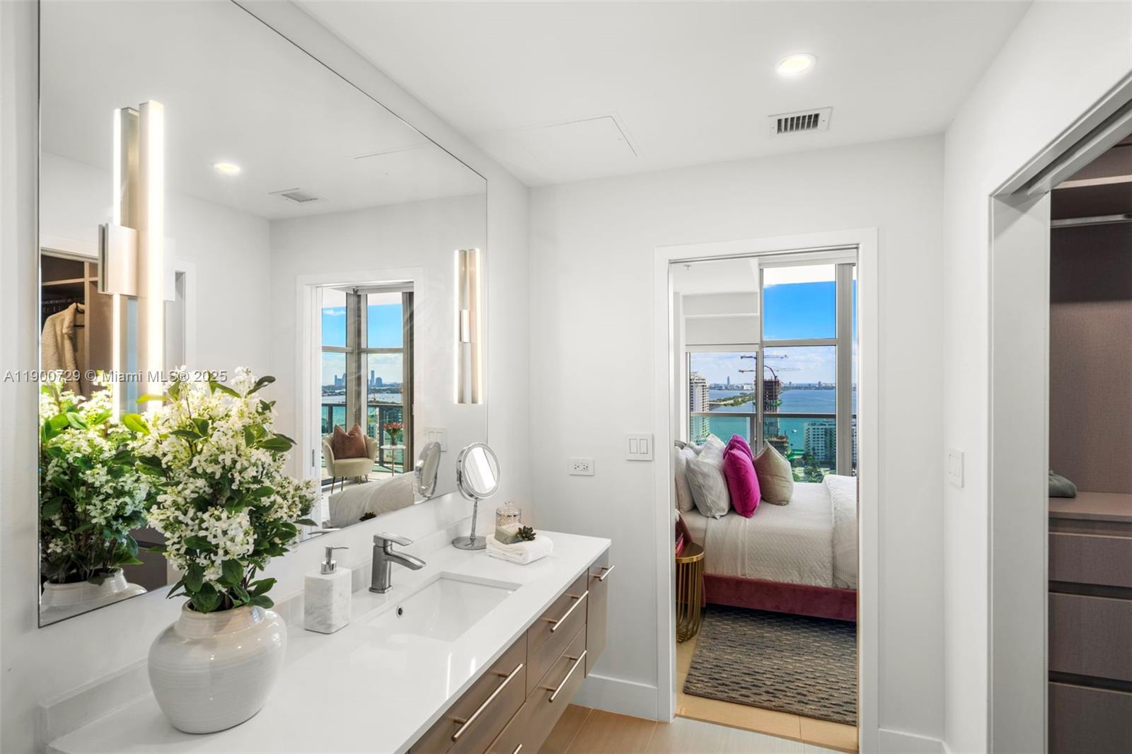 Impeccably renovated '12 line residence now available at Four Midtown. This expansive corner unit is the building's most coveted line, offering a spacious split floor plan, wrap-around balcony and views of the Miami Skyline and Biscayne Bay. New kitchen with waterfall countertop, stylish two-tone cabinets, farm sink and new appliances. Reconfigured primary suite offers an expanded custom closet that isn't standard on this floor plan. One of the most beloved elements of the '12 line is the balcony, which provides a wide covered section that acts as an indoor/outdoor retreat. Four Midtown was recently renovated with a new gym, pool and BBQ area. 24-hr security. Assigned parking. W/D in unit. Offered partially furnished with several designer pieces. Easy to show.