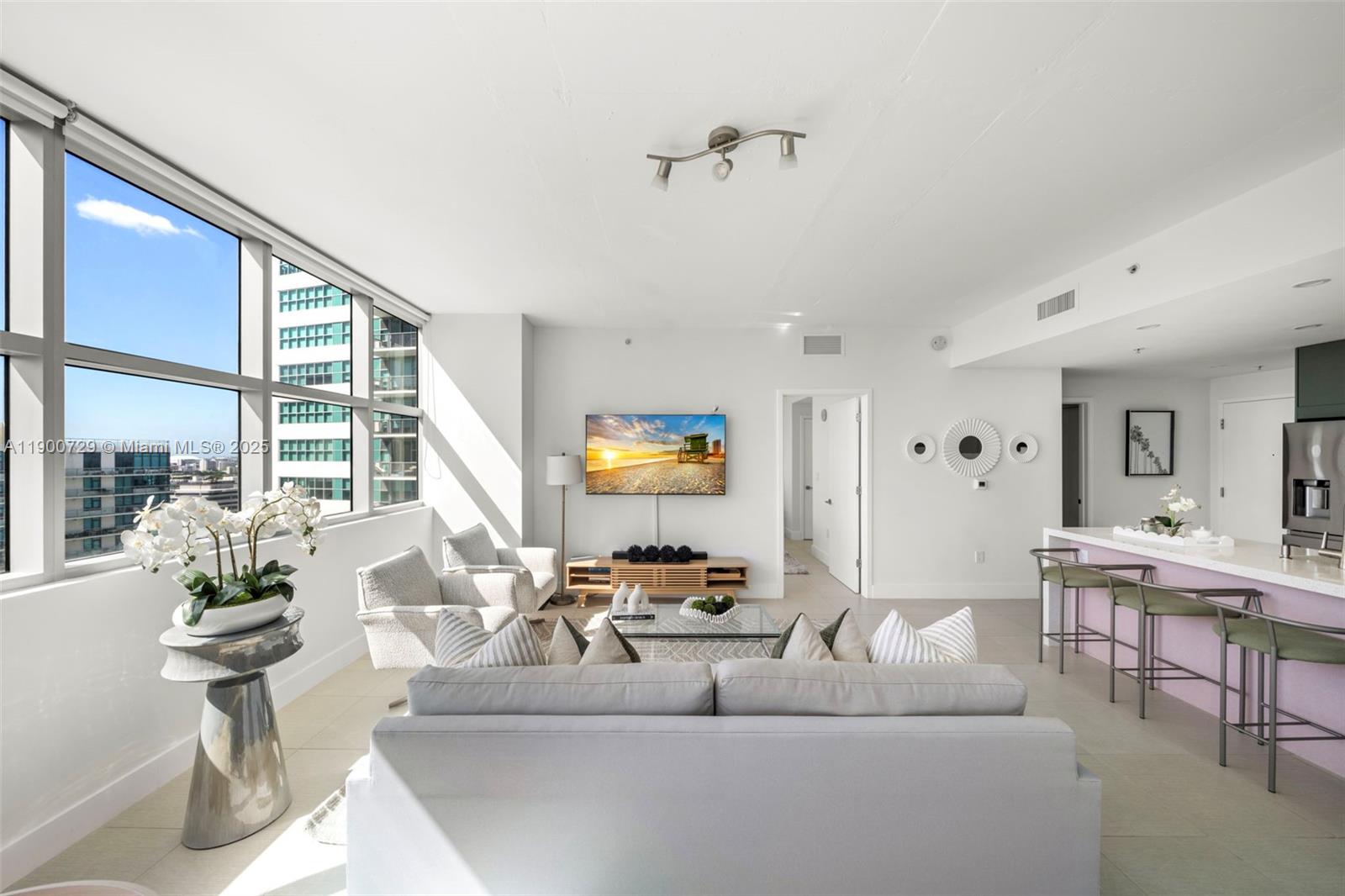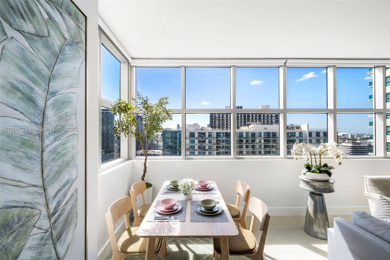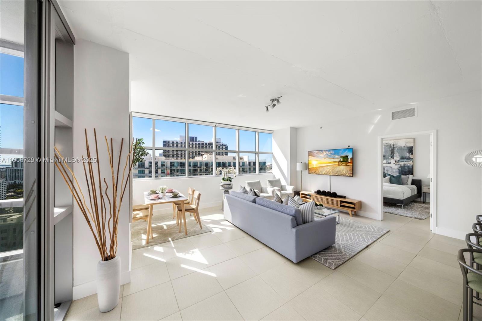 Impeccably renovated '12 line residence now available at Four Midtown. This expansive corner unit is the building's most coveted line, offering a spacious split floor plan, wrap-around balcony and views of the Miami Skyline and Biscayne Bay. New kitchen with waterfall countertop, stylish two-tone cabinets, farm sink and new appliances. Reconfigured primary suite offers an expanded custom closet that isn't standard on this floor plan. One of the most beloved elements of the '12 line is the balcony, which provides a wide covered section that acts as an indoor/outdoor retreat. Four Midtown was recently renovated with a new gym, pool and BBQ area. 24-hr security. Assigned parking. W/D in unit. Offered partially furnished with several designer pieces. Easy to show.