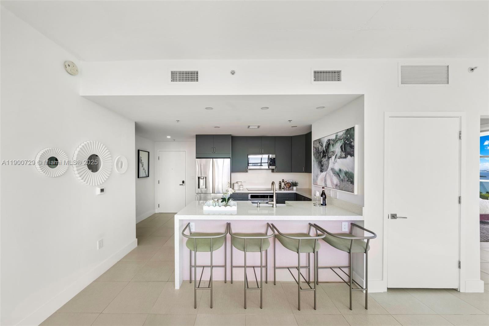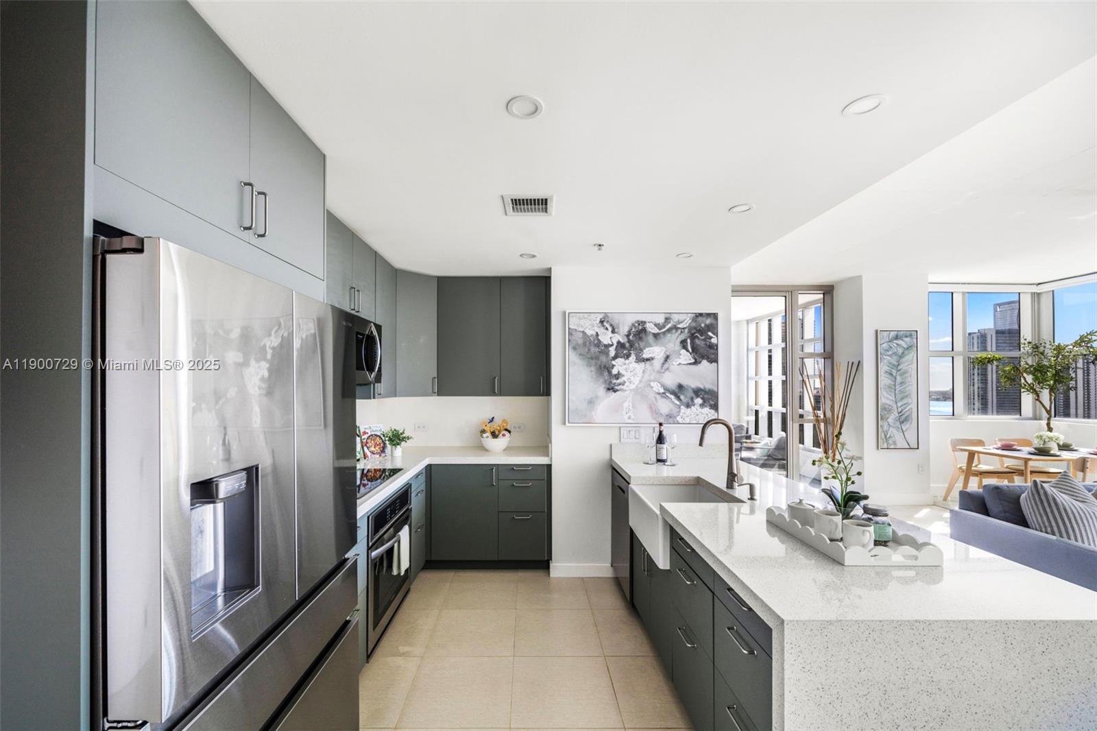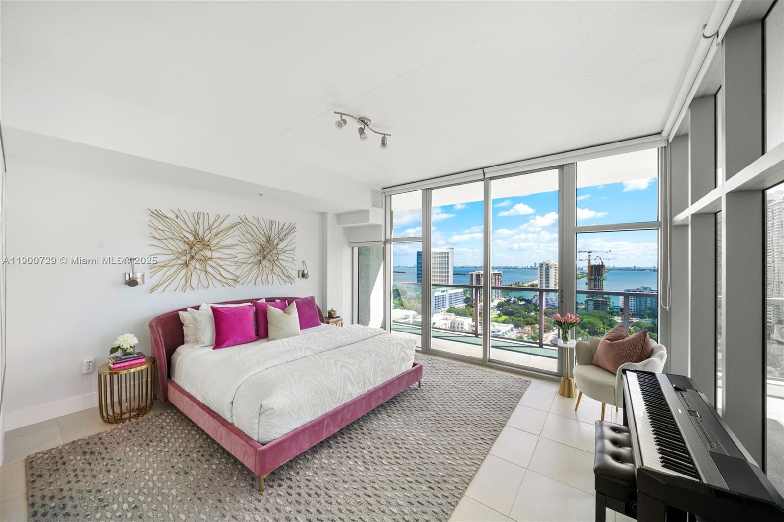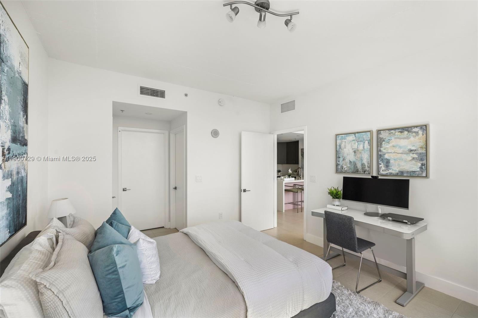 Impeccably renovated '12 line residence now available at Four Midtown. This expansive corner unit is the building's most coveted line, offering a spacious split floor plan, wrap-around balcony and views of the Miami Skyline and Biscayne Bay. New kitchen with waterfall countertop, stylish two-tone cabinets, farm sink and new appliances. Reconfigured primary suite offers an expanded custom closet that isn't standard on this floor plan. One of the most beloved elements of the '12 line is the balcony, which provides a wide covered section that acts as an indoor/outdoor retreat. Four Midtown was recently renovated with a new gym, pool and BBQ area. 24-hr security. Assigned parking. W/D in unit. Offered partially furnished with several designer pieces. Easy to show.