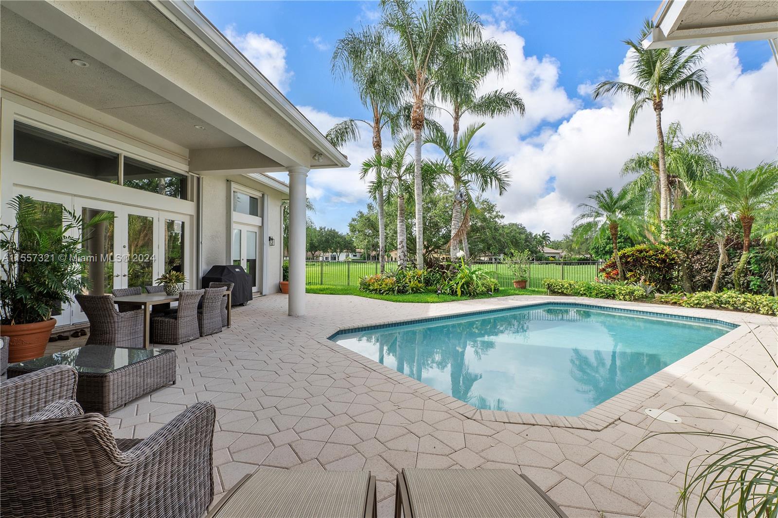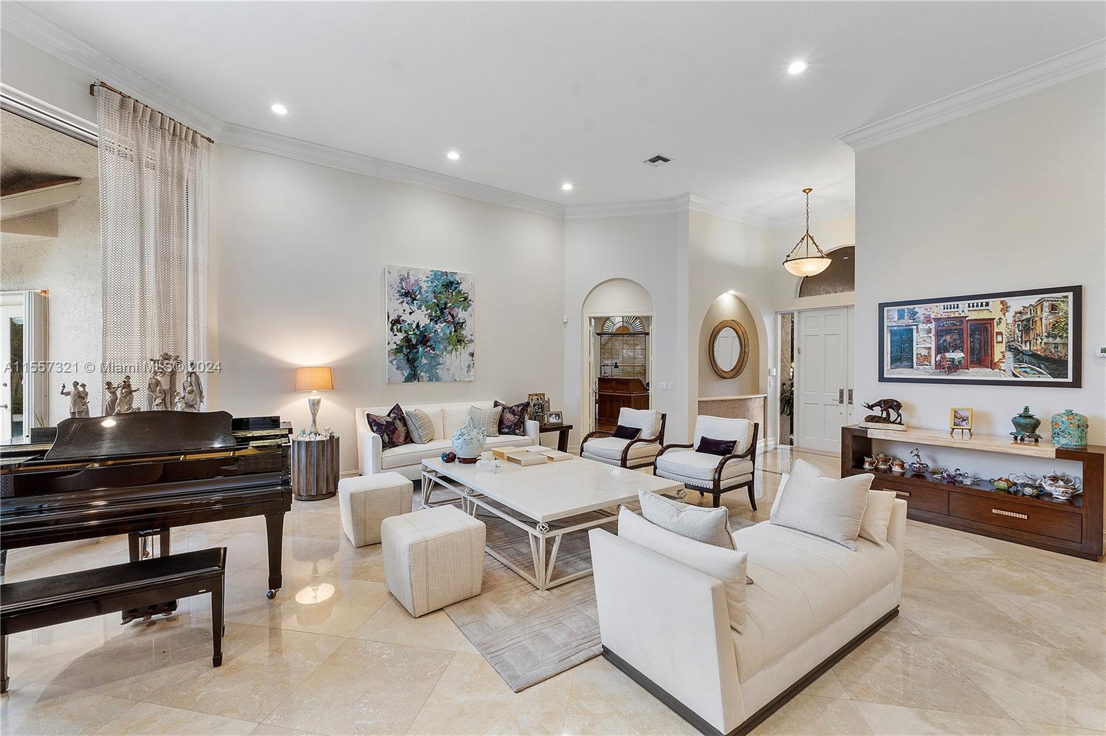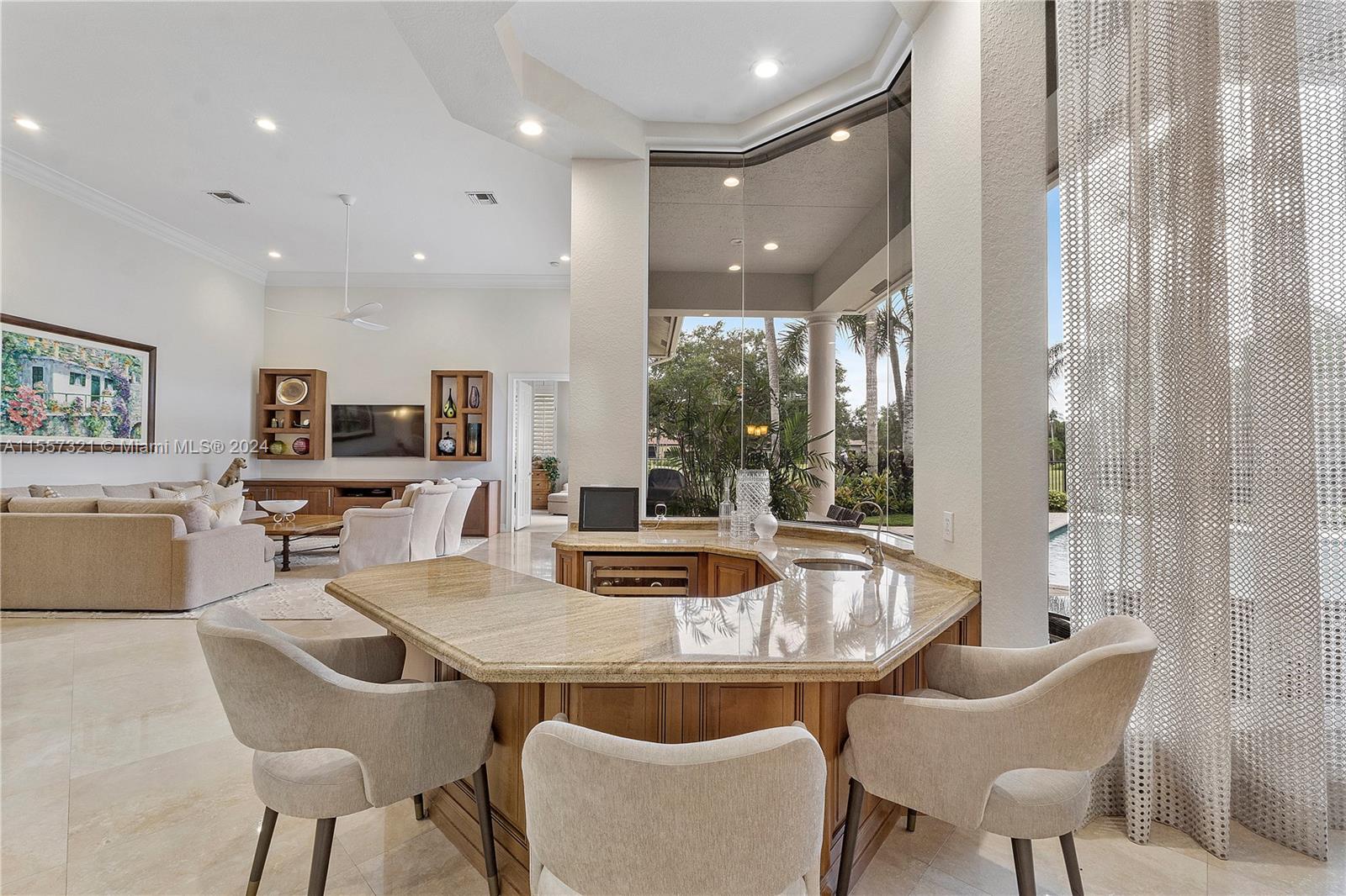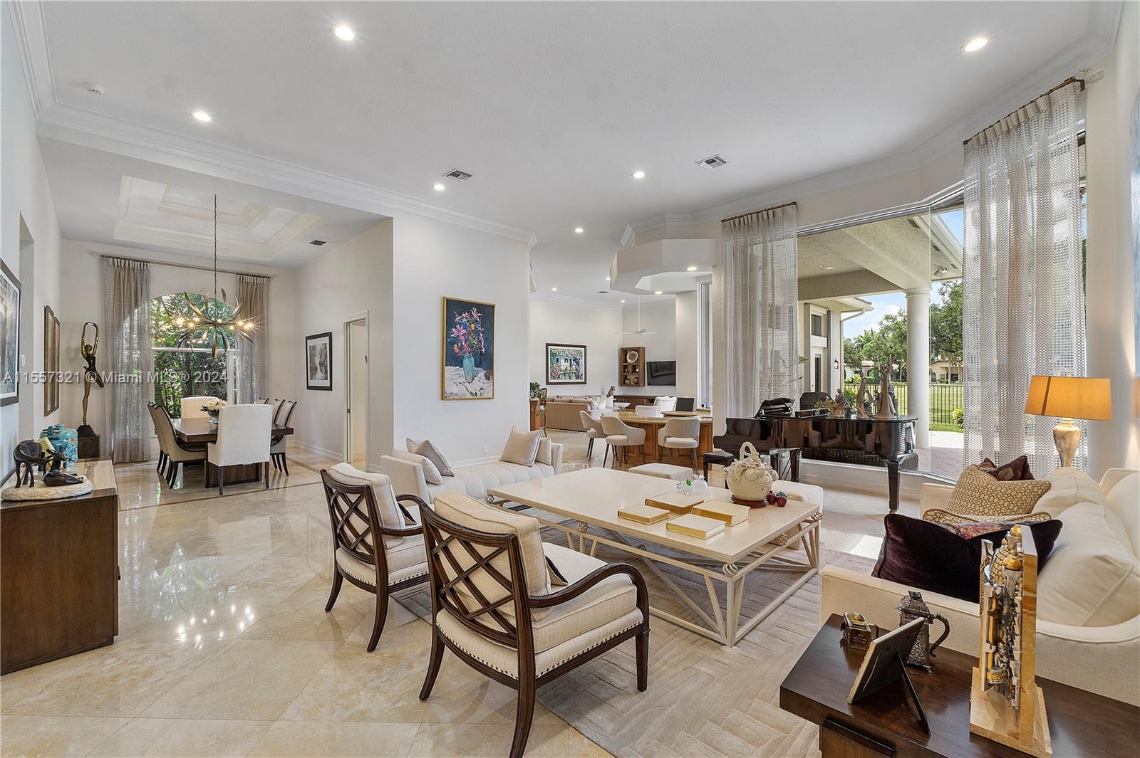Welcome to your luxurious retreat in the rarely available "Princeton" subdivision of Weston Hills Country Club! This Pristine and Stunning home offers a triple split floor plan with 5 bedrooms PLUS office/den and 4 1/2 baths. Features include: marble floors through-out living areas, volume ceilings with gorgeous crown moldings & LED lighting, formal dining room, formal living room with wet bar & a beautiful updated kitchen with center island, top of the line appliances & breakfast area. In addition, primary suite with sitting area, spa-like bath, & two spacious walk-in closets. Enjoy the relaxing outdoor area with a covered patio, heated pool, lush landscaping & vast golf course views! Newer Roof (2019) & a grand circular driveway with 3 car garage!