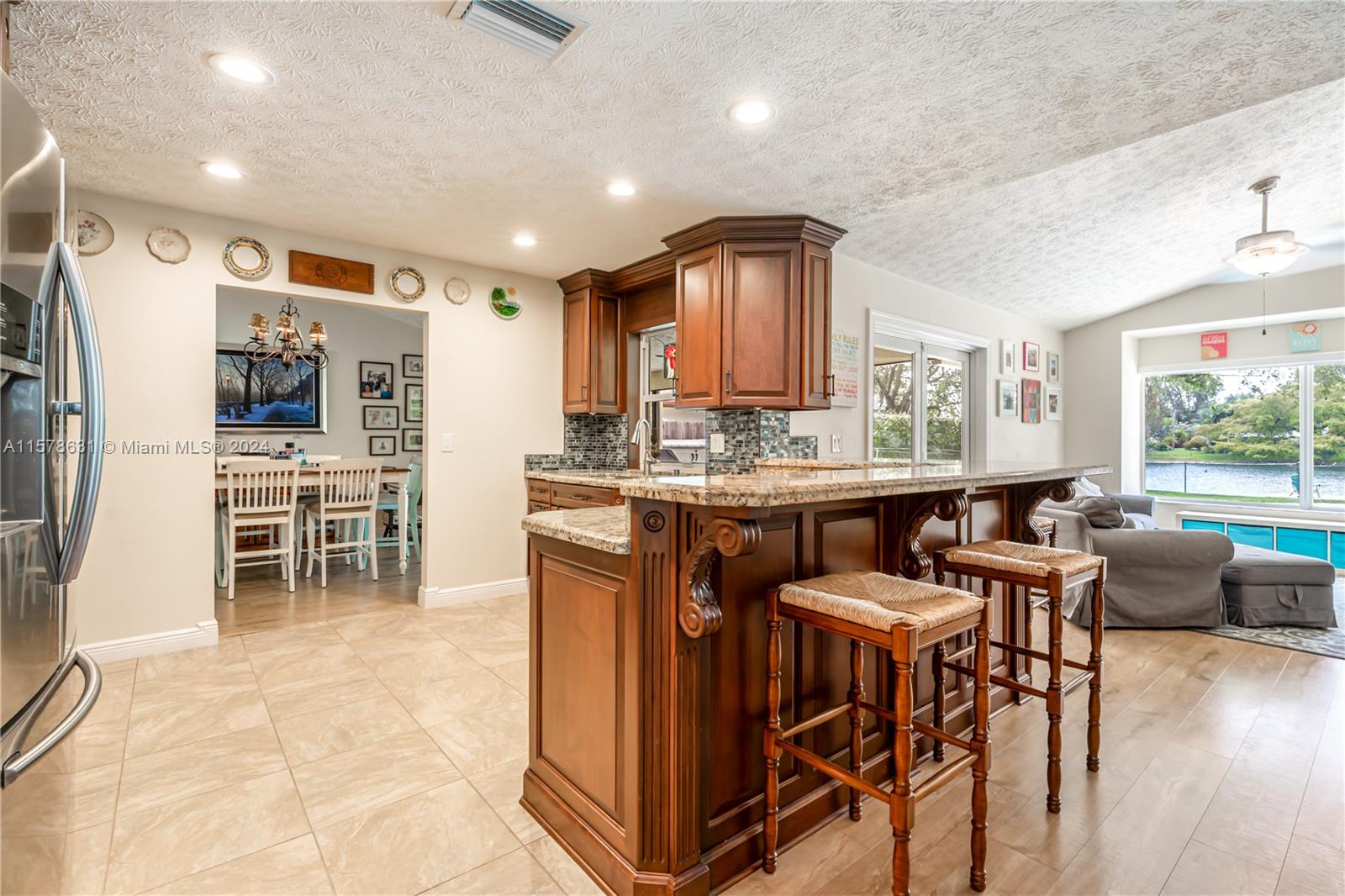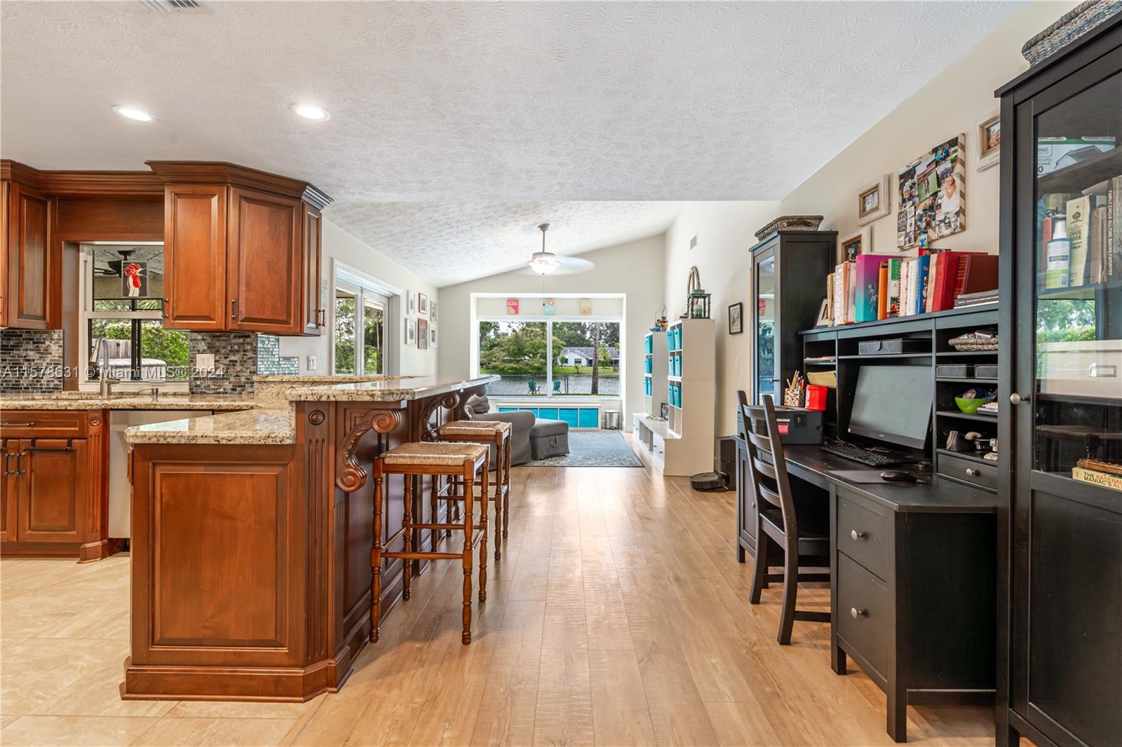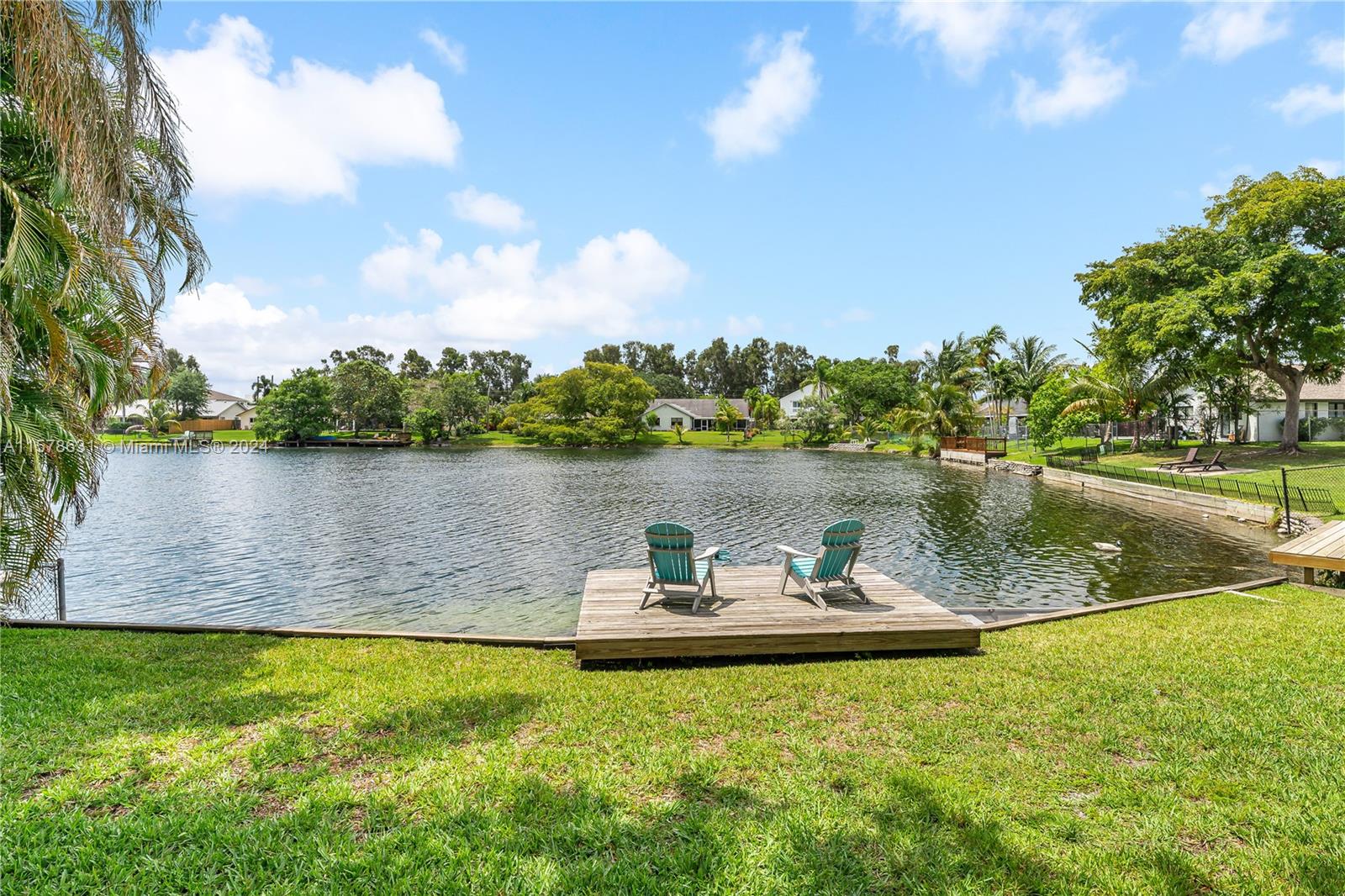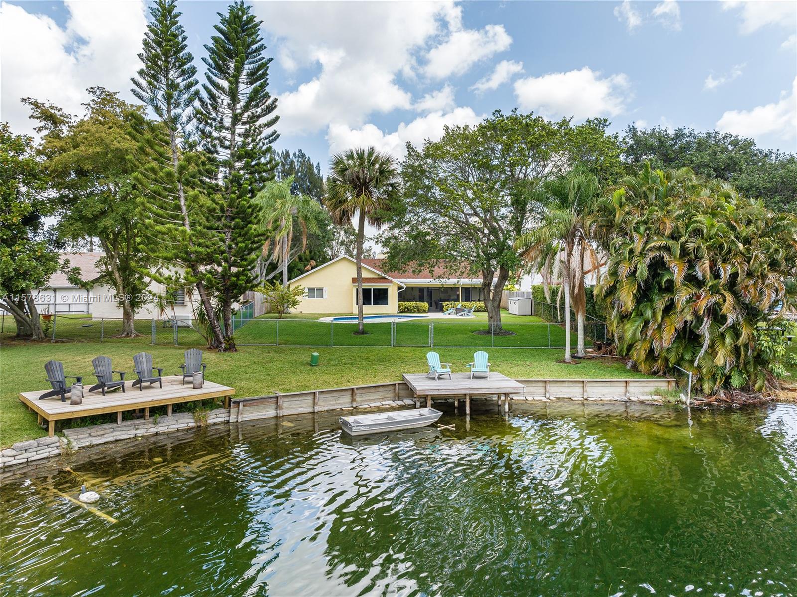 Rarely available in Davie Lake Estates ~ zoned for sought after Pioneer/Cooper City High. This beauty has over $290,000 in upgrades: custom hardwood kitchen with stainless package, 2023 roof, 2018, pool, 2015 impact windows & doors, beautiful vinyl flooring, custom builtins (all closets & garage) Stone wall on fireplace...the list goes ON & ON! Open floor plan with vaulted ceilings & gorgeous views from the many windows & doors. Split bedrooms. Step outside to a true South Florida paradise complete with covered screened patio, sparkling pool AND breathtaking water view. Sit on the dock and fish or enjoy the sunset. HOA only 250/year. Large fenced lot with plenty of room for play, pets & garden. Terrific location off with easy access to both public & private schools, shopping & highways.