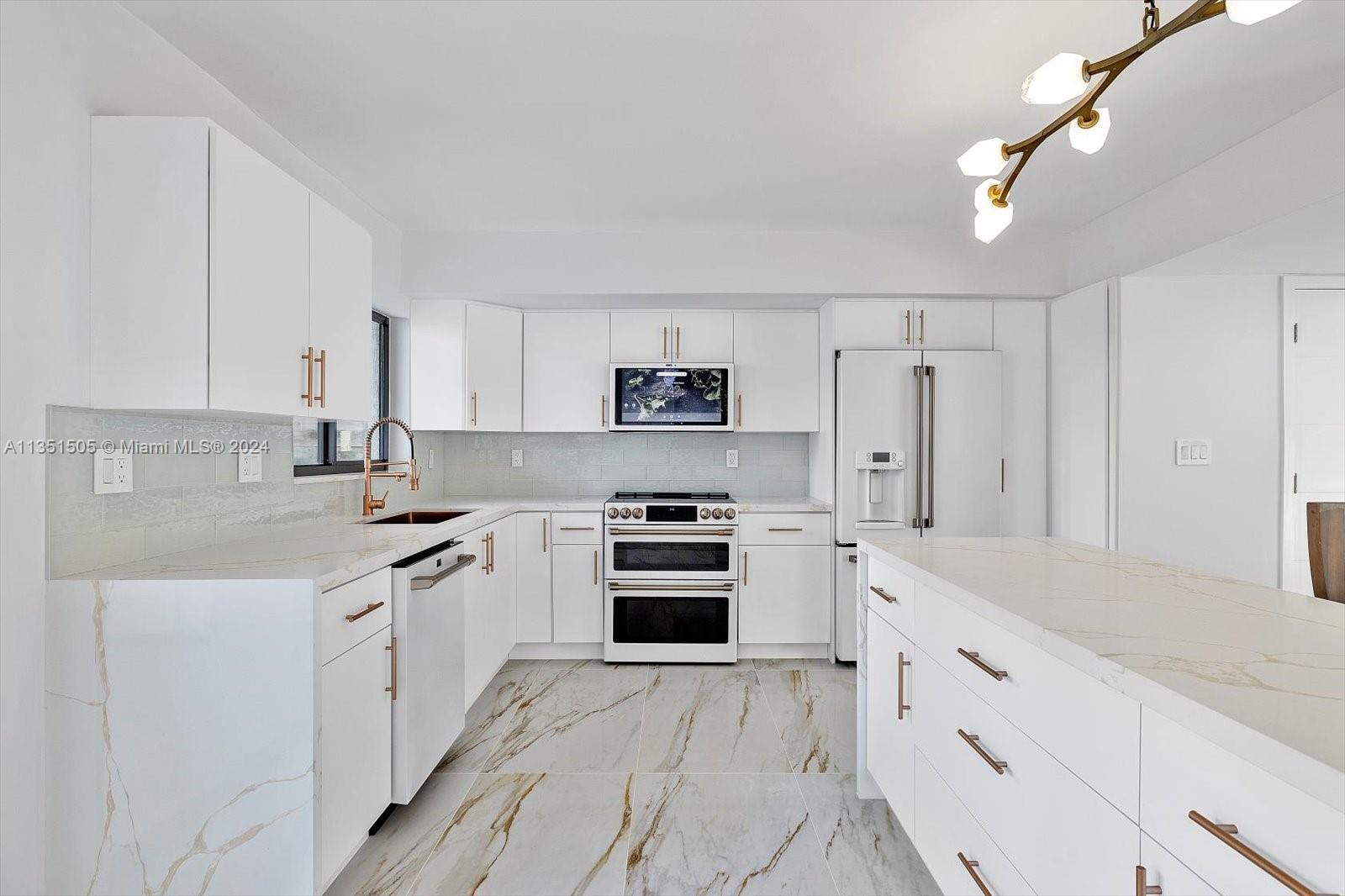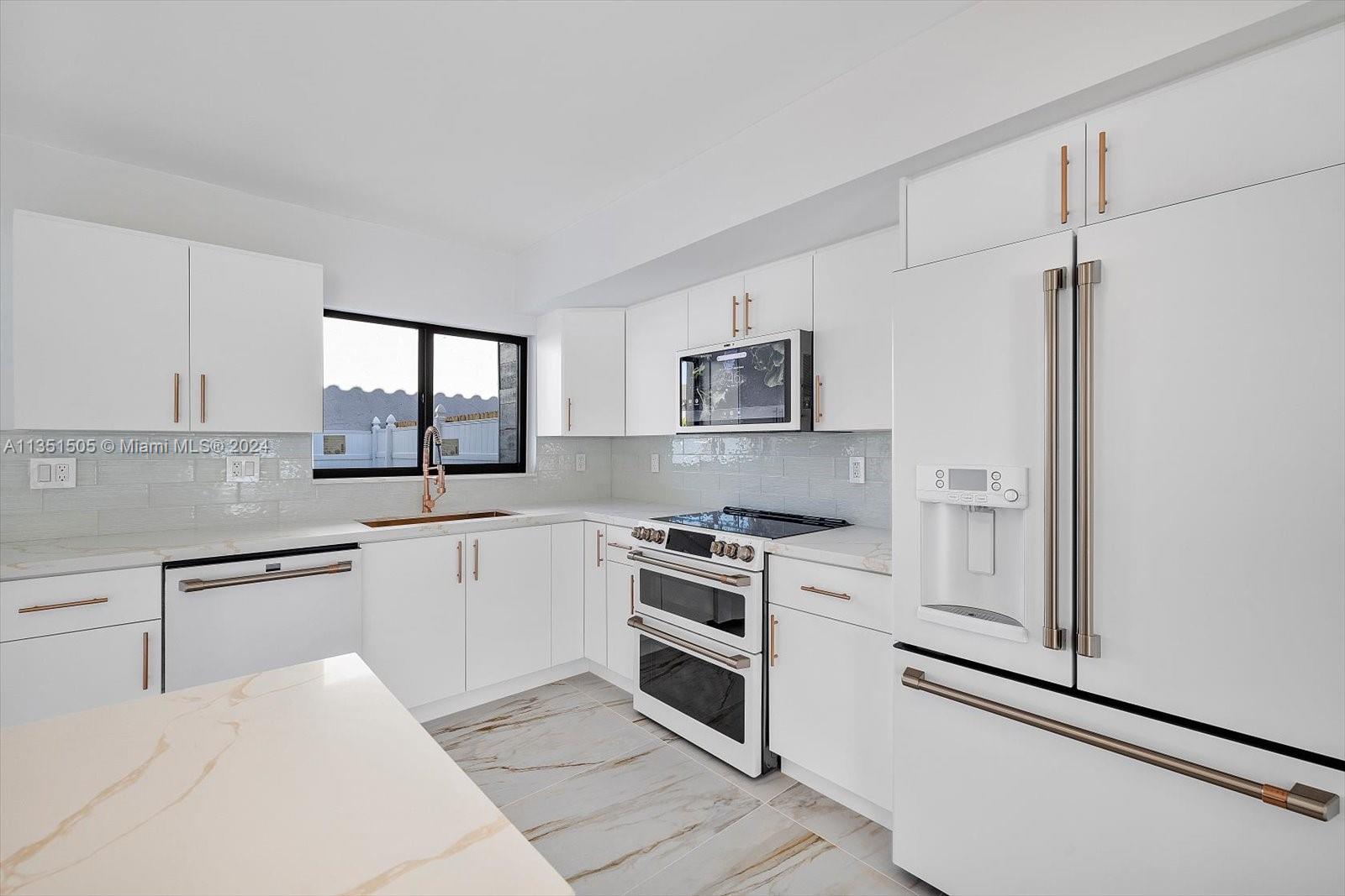 Exquisitely modern and totally renovated two story townhouse on great location. It has 1590 sf, 3 bedrooms 2 & 1/2 bath in desirable Lakeview development on Eastern Shores. Featuring all impact windows & doors, new modern Italian kitchen with island, exclusive Cafe collection of stainless steel appliances, new extra large porcelain floors, new modern bathrooms, in bathroom speaker system, new fence patio great for entertaining, over-sized balcony off master, new lamps plus recessed lighting throughout, all new a/c, high capacity washer & dryer. Steps to the pool area w/ 2 assigned parking spaces and plenty of guest parking. New recently installed roof. Close to the beach , Aventura mall ( Sunny Isles), close distance to restaurants, Oleta Park, Shopping, Houses of Worship, theater & more.