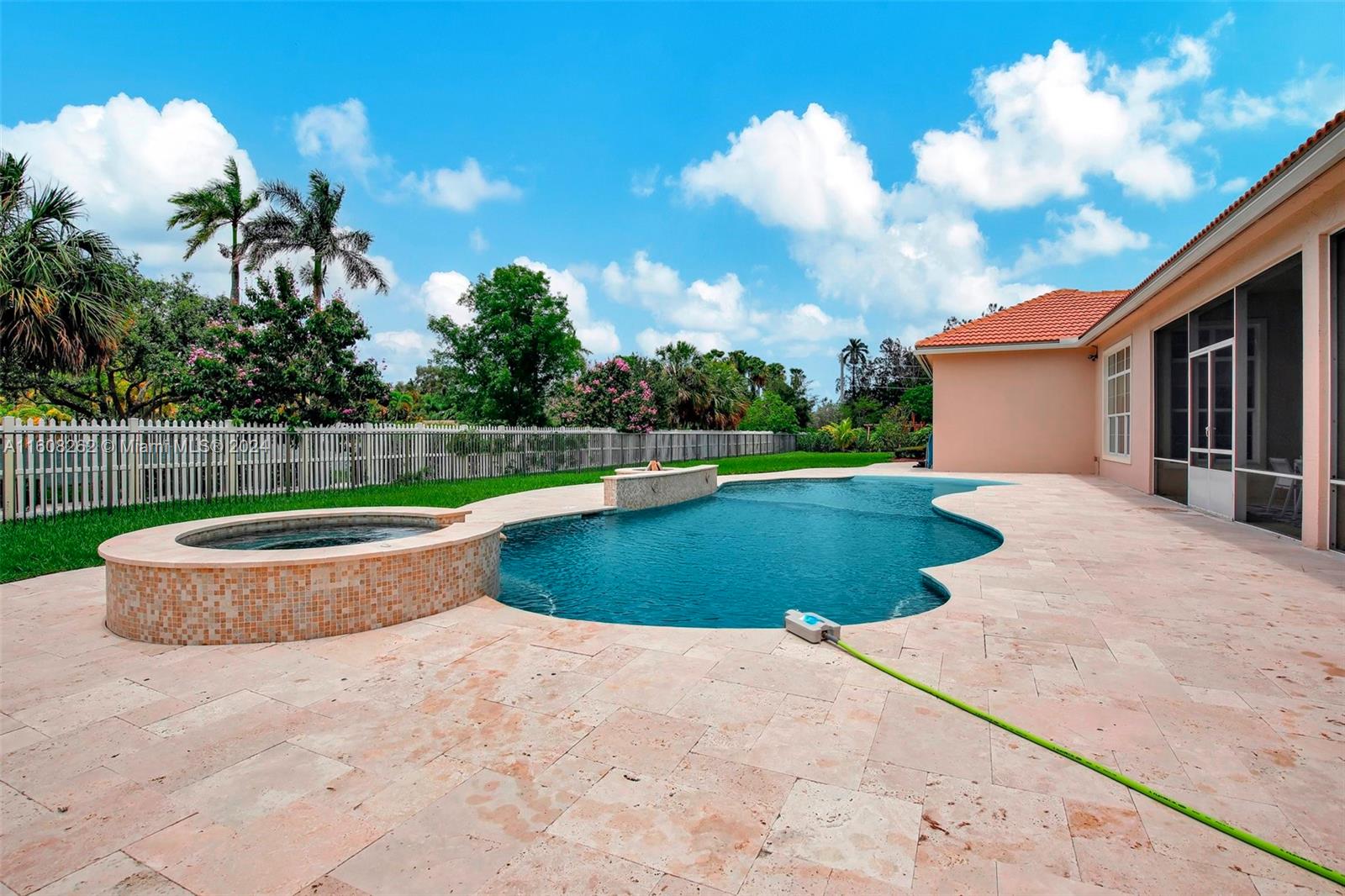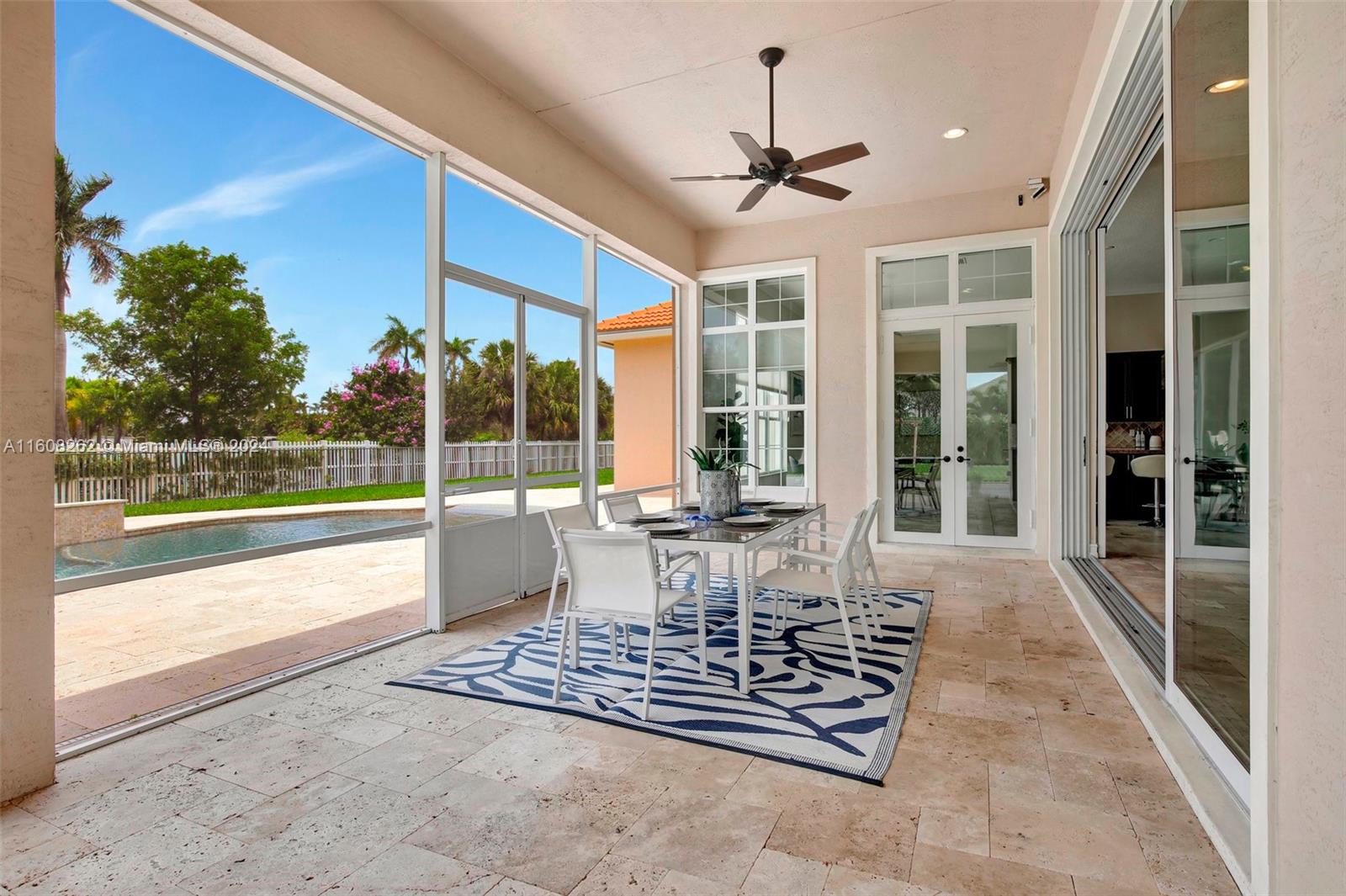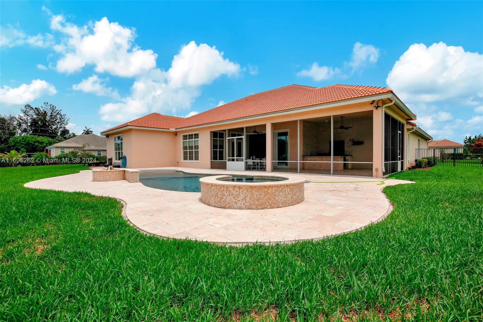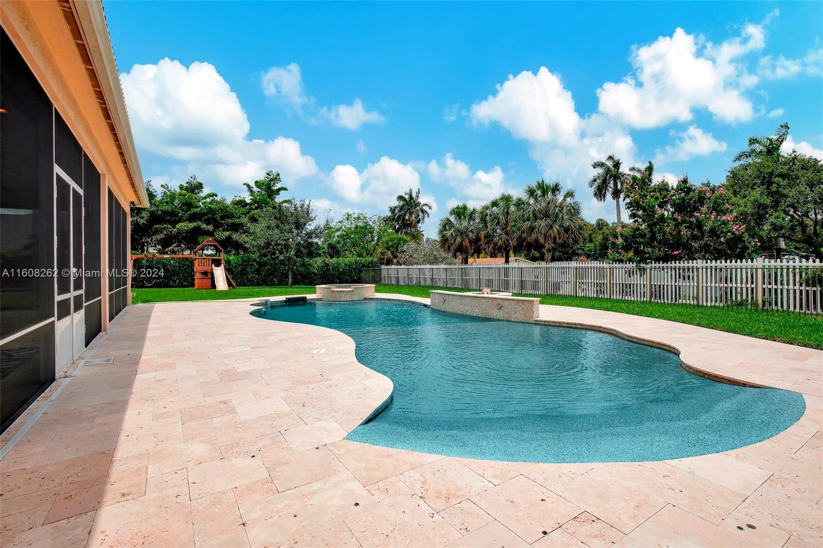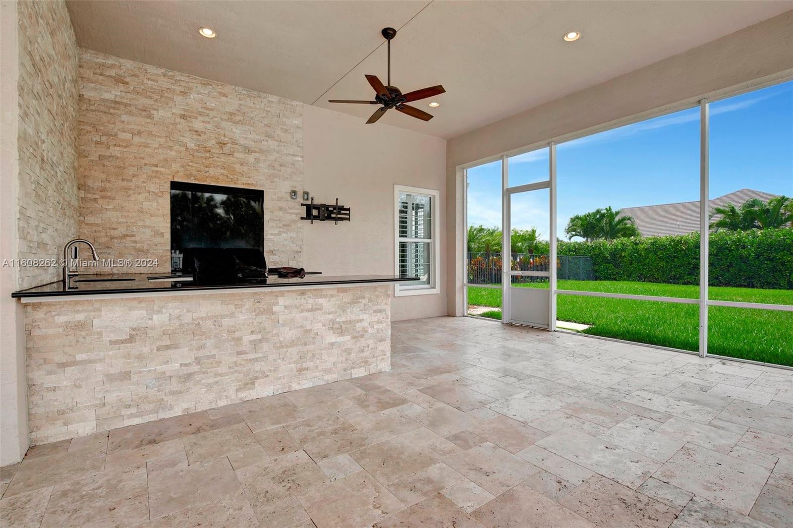 Experience luxury living in this magnificent Hawthorne model home on sprawling .80-acre lot 5 bedroom, one is used as office, 4.5 bath with flex space, this residence offers spacious and adaptable living. Culinary enthusiasts will revel in chef's kitchen, complete with granite countertops and top-of-the-line GE Monogram appliances. True oasis awaits with beach-entry saltwater heated pool and raised spa, all surrounded by travertine. Screened patio, featuring an outdoor kitchen, is perfect for year-round enjoyment. This home is equipped with impact windows and power outlet for generator. HOA fee covers lawn cutting and tree trimming. Living in Sterling Ranch combines luxury and convenience with prime location near major highways and attractions.