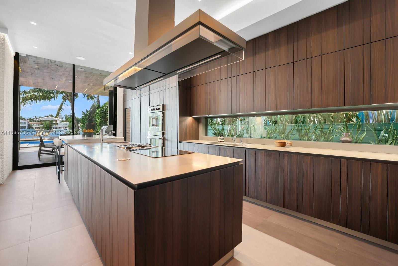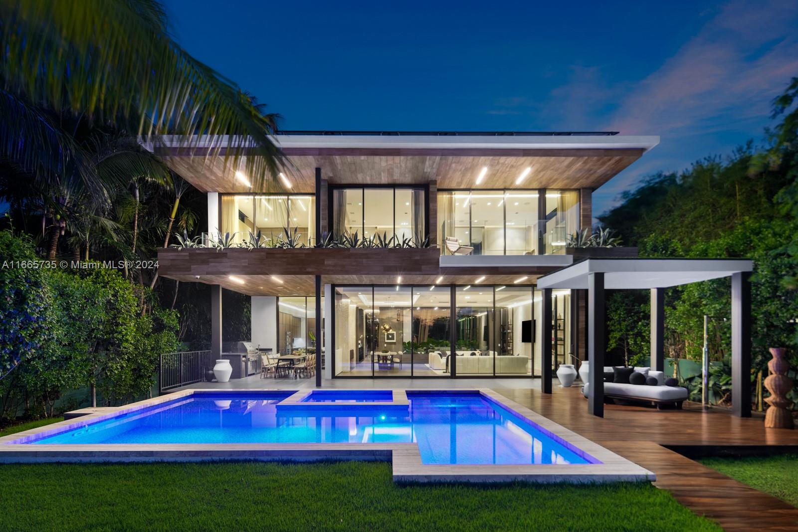 Discover luxury living in this low-impact Tropical Modern estate by renowned architect Max Strang. Located in the prestigious Venetian Islands, this gem blends sophisticated design w/ cutting-edge technology & waterfront living. The open-concept layout features a gourmet kitchen w/ custom Italian walnut cabinetry,Miele appliances, twin Sub-Zero refrigerators, & a wine fridge?ideal for entertaining. With 4 elegant bedrooms and 4.5 bathrooms, the primary suite boasts a spa-like en-suite with water views.Enjoy a Sony home theater, elevator, & Crestron smart home system.This Tesla solar-powered home emphasizes sustainability.Step outside to a tropical paradise with a mosaic-tiled pool, outdoor kitchen, & a private dock with 60' waterfrontage, showcasing breathtaking views of the Miami sunsets.