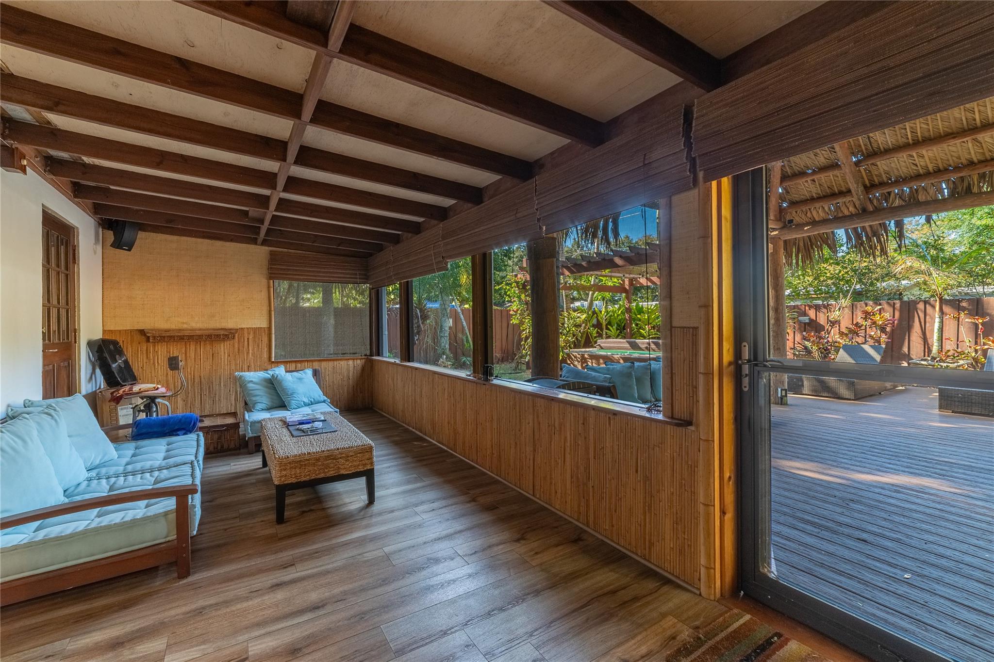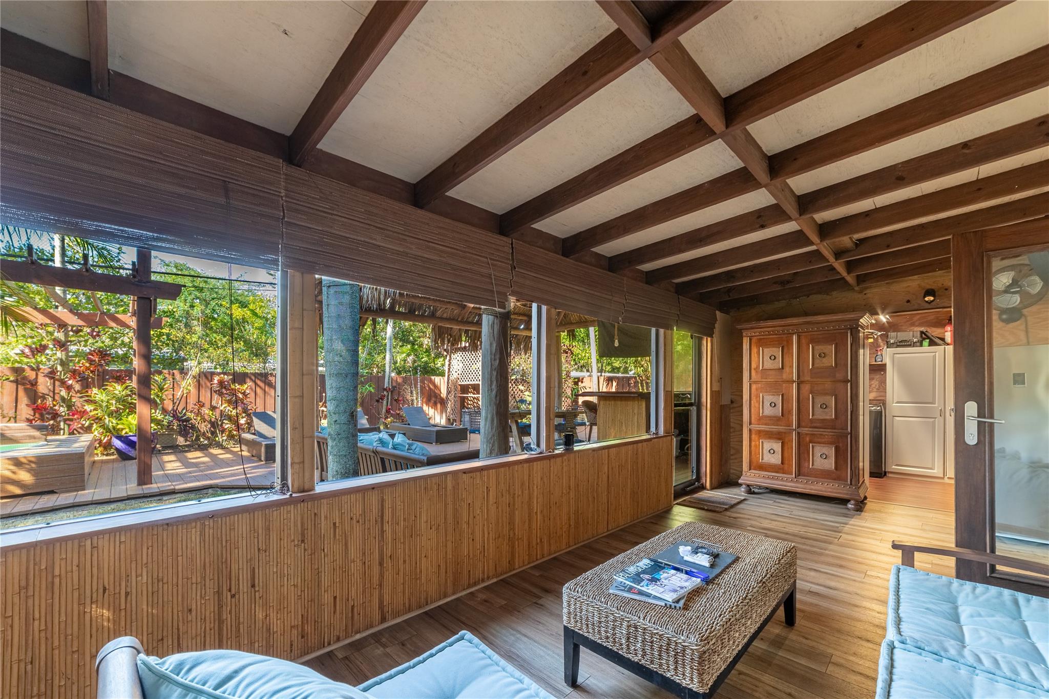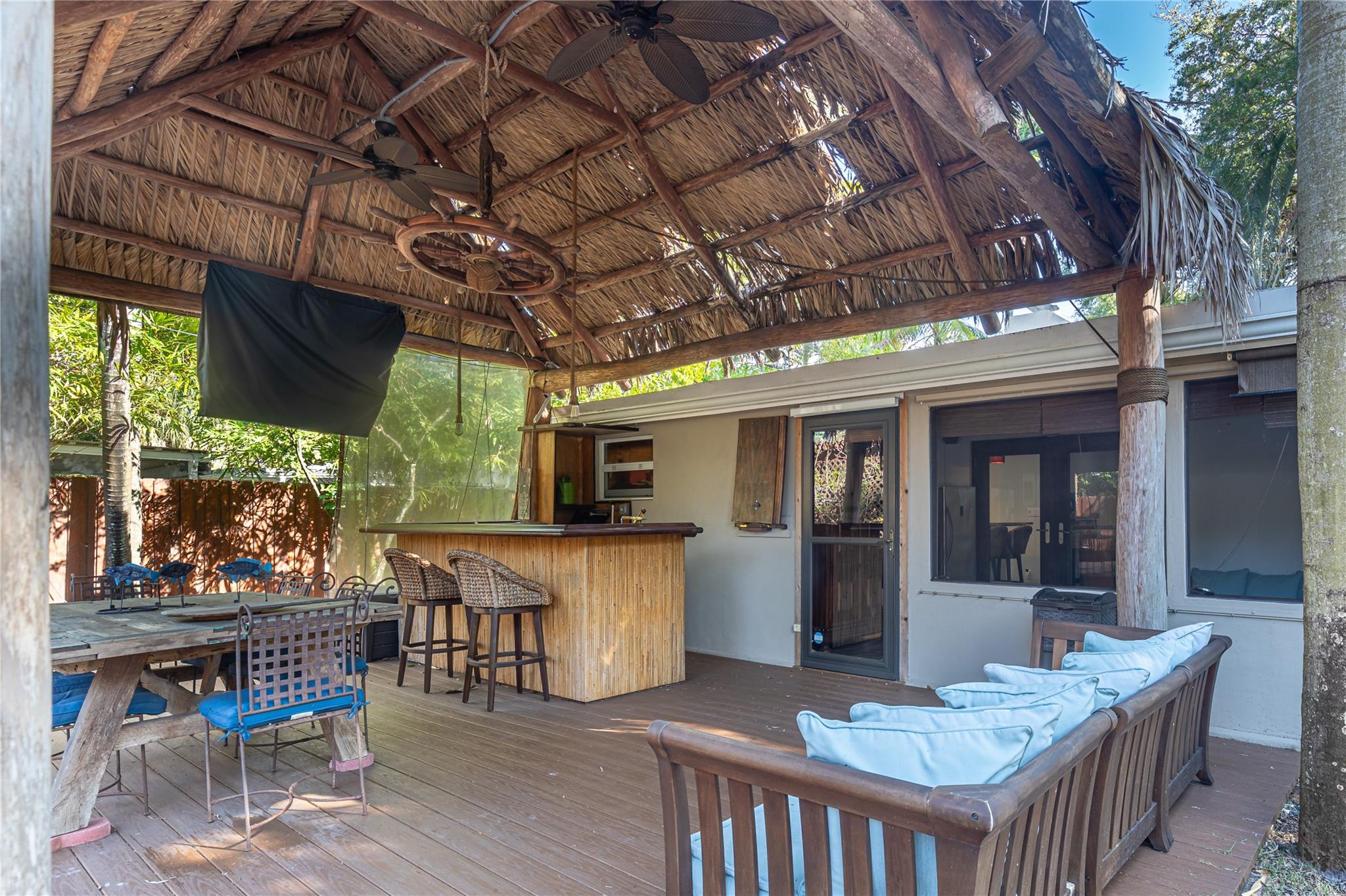 Shady Banks 3 bed 1 bath Home with Terrazzo Floors, Split Bedroom, Fireplace, Plantation Shutters, Oak Wood Interior Doors, French Doors. Huge Screened Porch. Great outdoor entertaining areas with 300sf Seminole built Chickee Hut, Hot Tub. Mature Tropical landscaping. Neighborhood has one way in/out, surrounded by the New River. 2 parks with volleyball, tennis, playground, softball field, 1/2 court basketball court, fitness stations. Passive Nature Preserve on the river with walking paths, boardwalks, natural shoreline, next to New Safe Harbor Marine. Tranquil neighborhood with Old Florida feel. Enjoy Privacy & Serenity while being in a Fantastic location minutes to downtown Las Olas, The Airport, Port Everglades. 4.5 miles to the Beach.