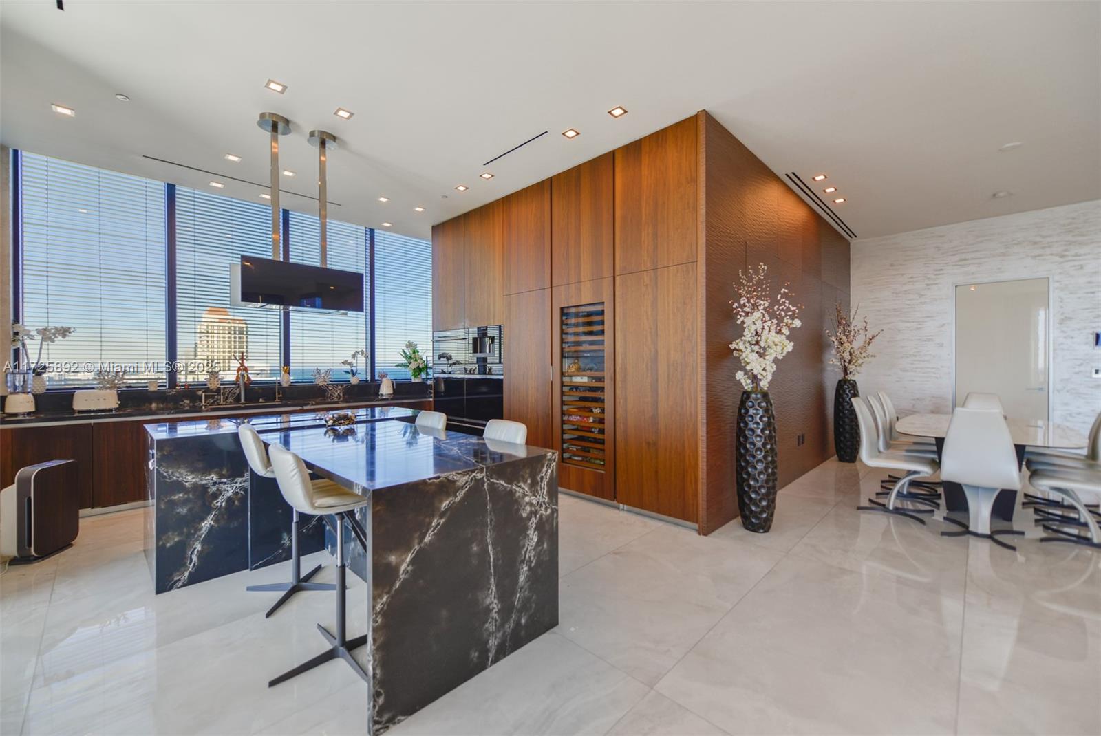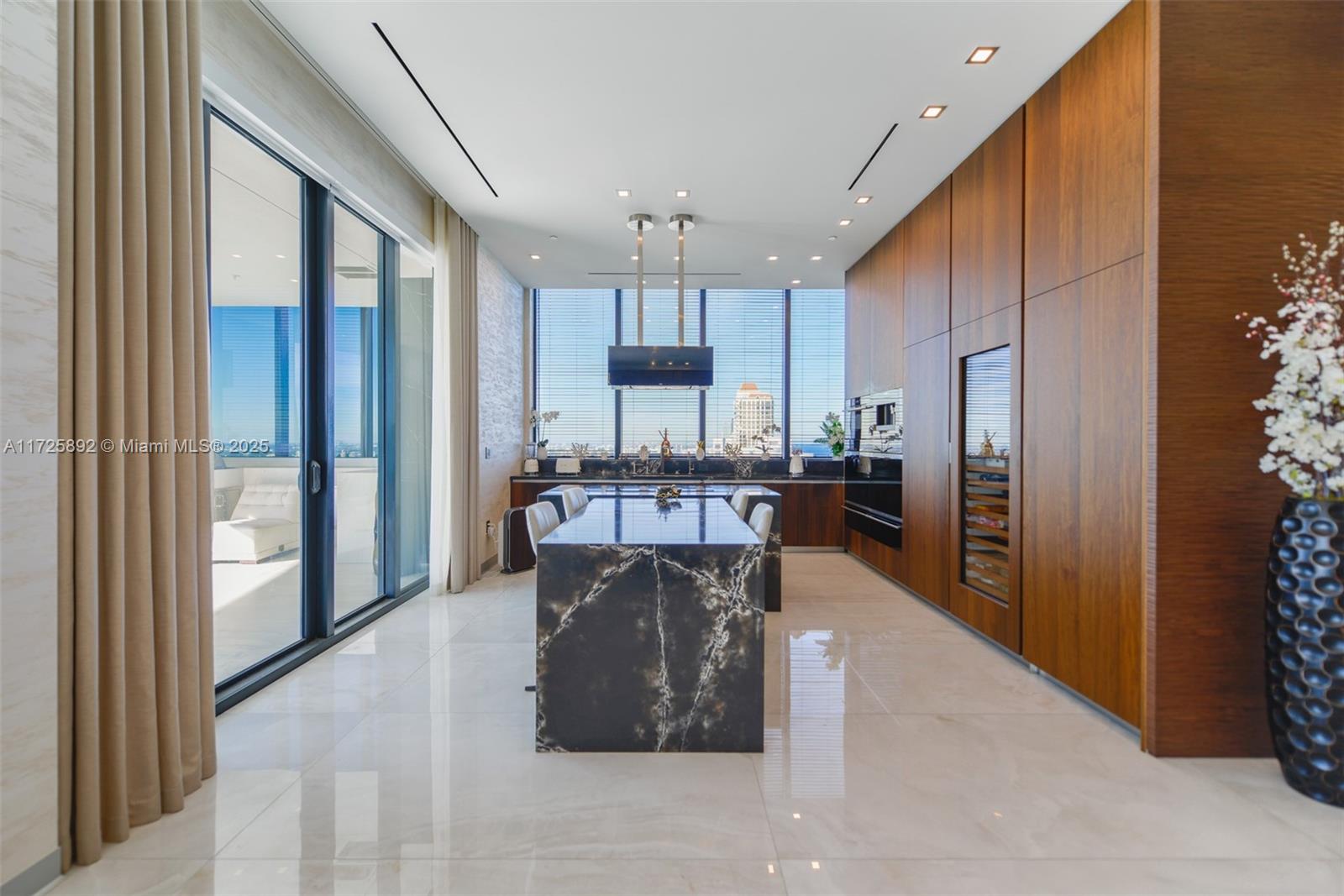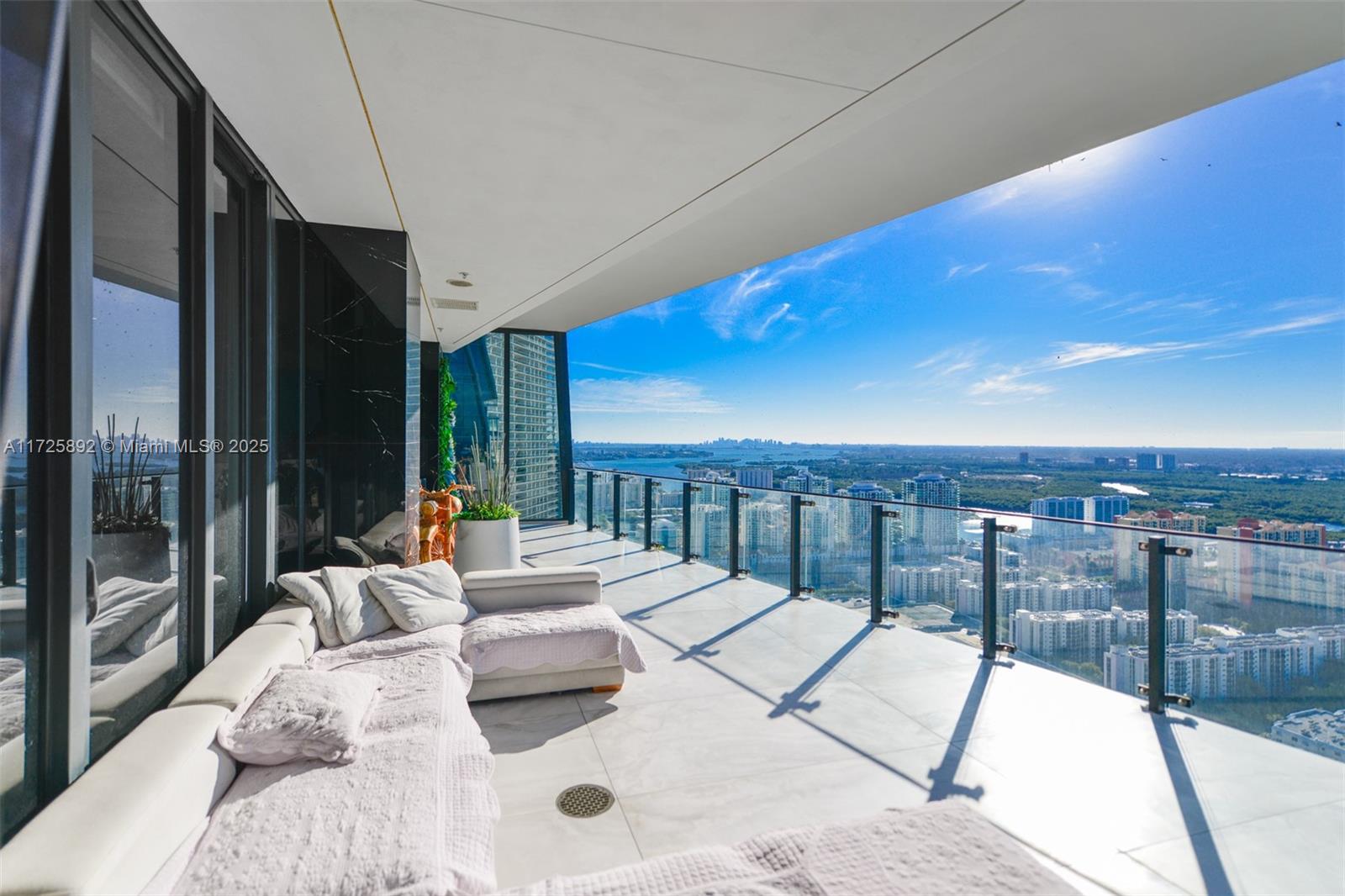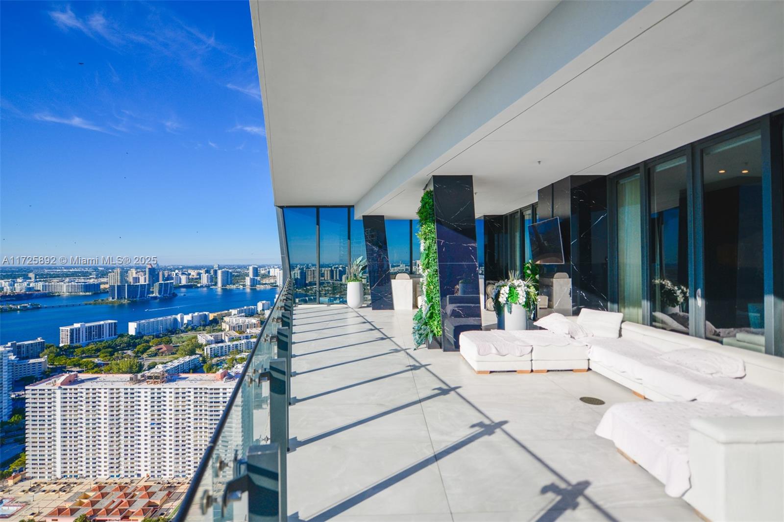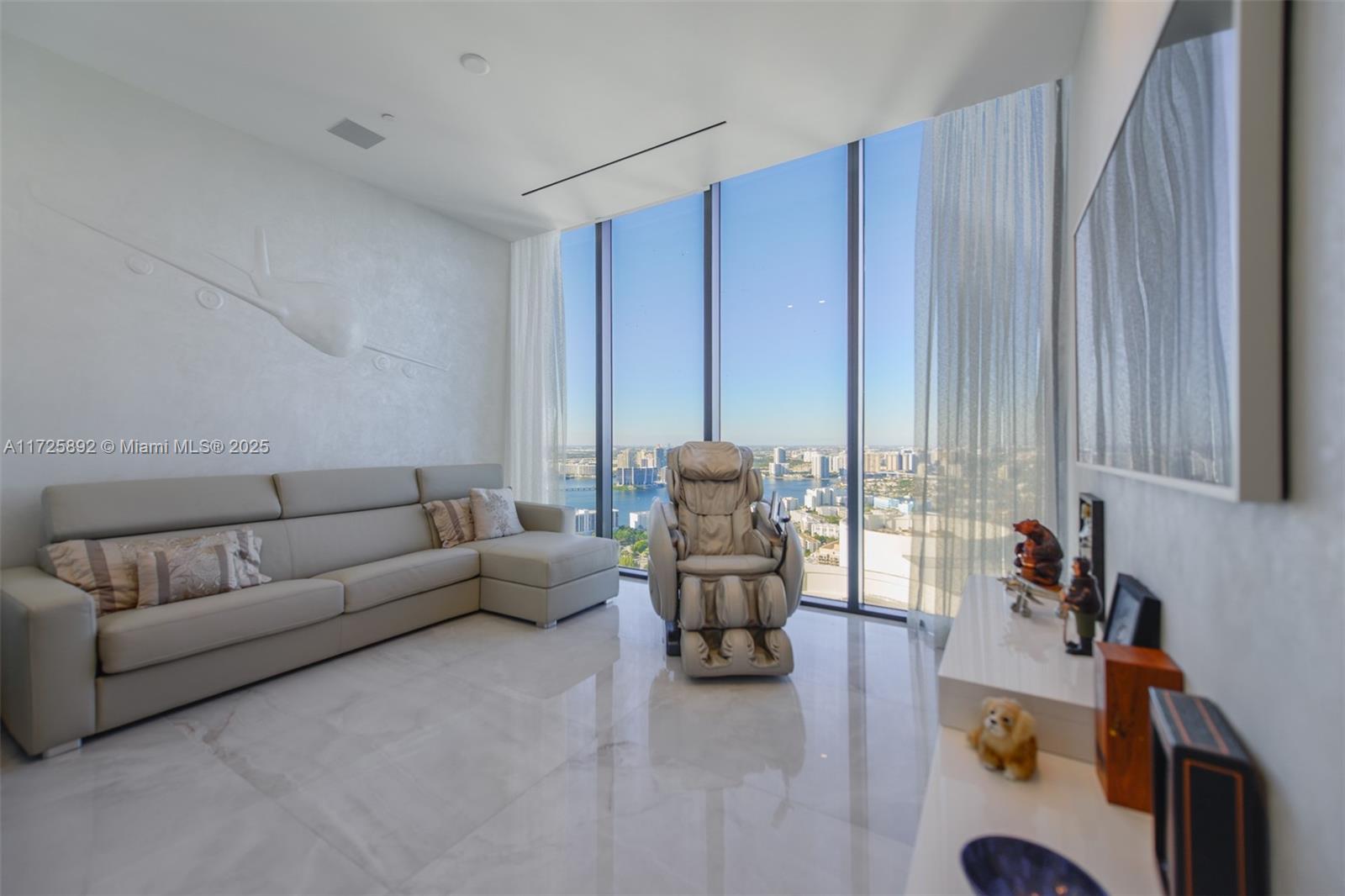 Enjoy unobstructed City, Intracoastal, and some ocean views from this high-floor corner residence in Muse Sunny Isles Beach. This remodeled with designer finishes 2 bed and 2,5 bath smart home unit with private foyer entry, 12' ceilings, and gourmet kitchen. The floor plan was improved by expanding the living room, Italian porcelain floors throughout, bubble water panel with LED lights, handcrafted onyx in the guest bathroom, bamboo wallpapers, black marble slabs give the elegant covering of the columns at the balcony, and Italian doors. Large outdoor living space w/summer kitchen. With only 63 ultra-luxury exclusive residences Designed by Carlos Ott, an edge pool and spa overlooking the Atlantic Ocean, a State-of-the-art fitness center, and a Fully automated parking system.