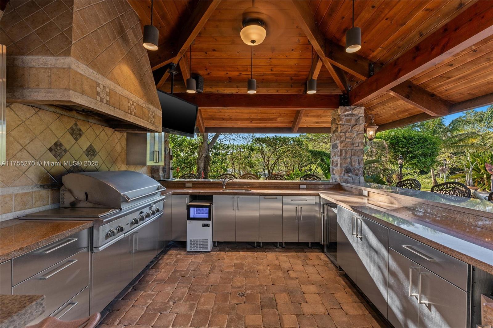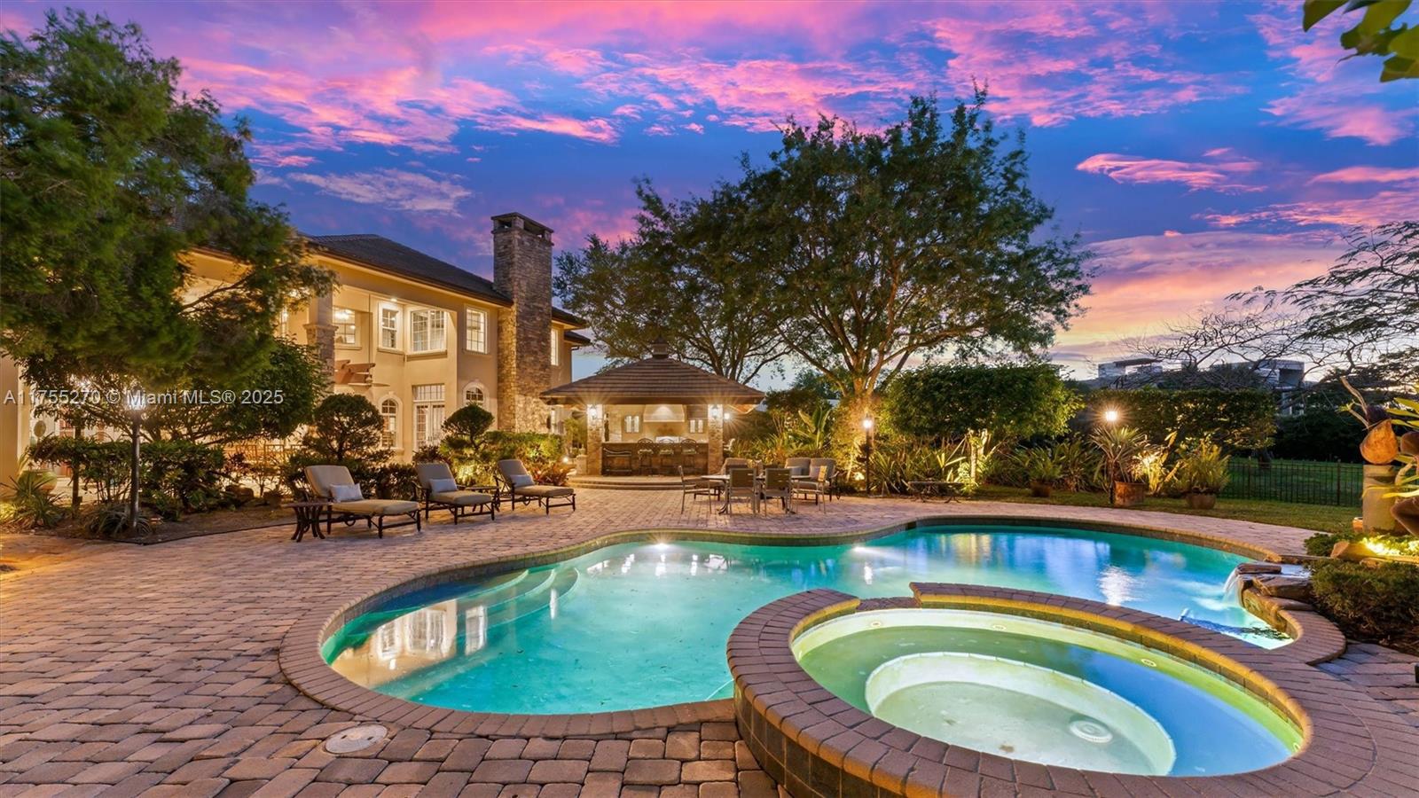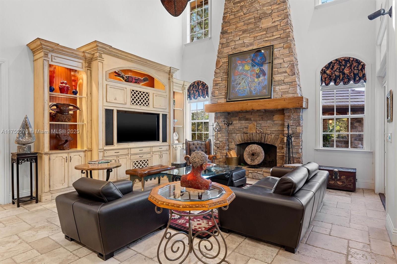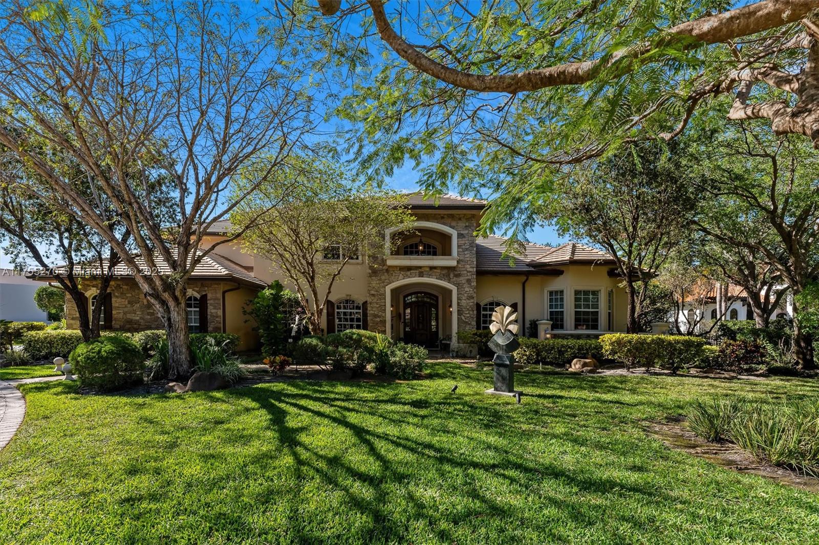 WELCOME TO EXCLUSIVE COMMUNITY OF GRAND OAKS IN DAVIE! This stunning lakefront estate is 1 of 32 custom homes. It offers 5 bedrooms, an office, loft, 5.5 baths and sits on a builder's acre. Enter through soaring 20' ceilings in the foyer, living, and family rooms, both with fireplaces. Enjoy wood, marble, and Jerusalem stone finishes. A custom bistro bar, hand-painted murals, and Chicago brick accents enhance the kitchen and butler's pantry, with a Thermador gas cooktop, grill, and pot filler. The in-law suite has a private entry, private kitchen and cabana bath. The lush, tropical yard boasts mature landscaping, a resort-style pool with a waterfall spa, a summer kitchen, all-impact glass, a 48KW generator with a 1,000-gal tank, and a 250-gal tank for the BBQ, cooktop, and fireplace.