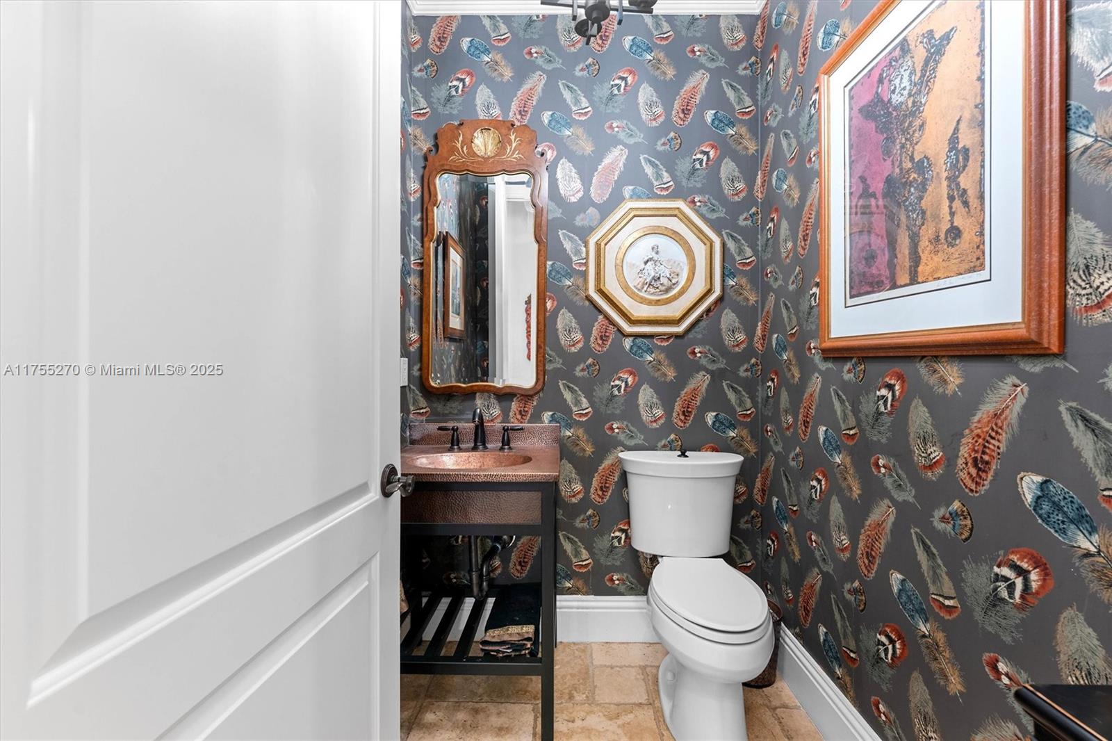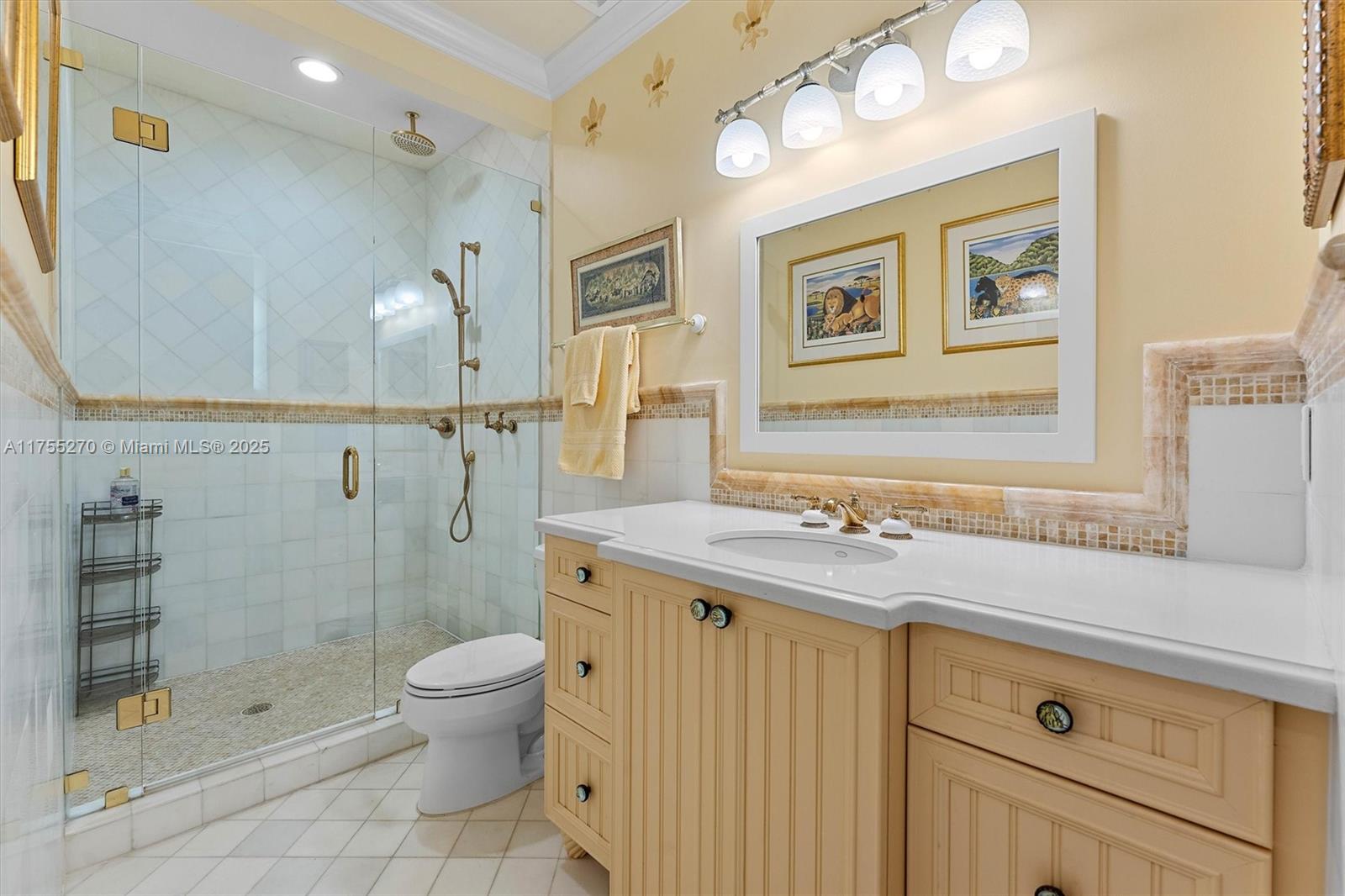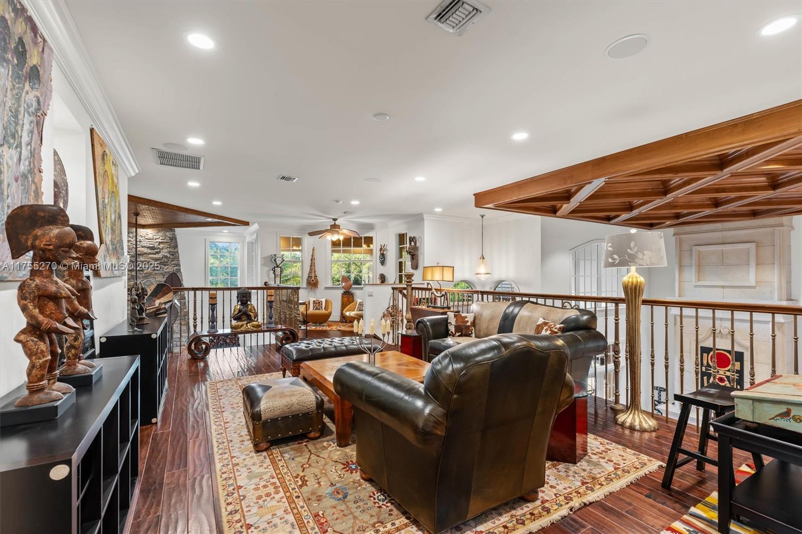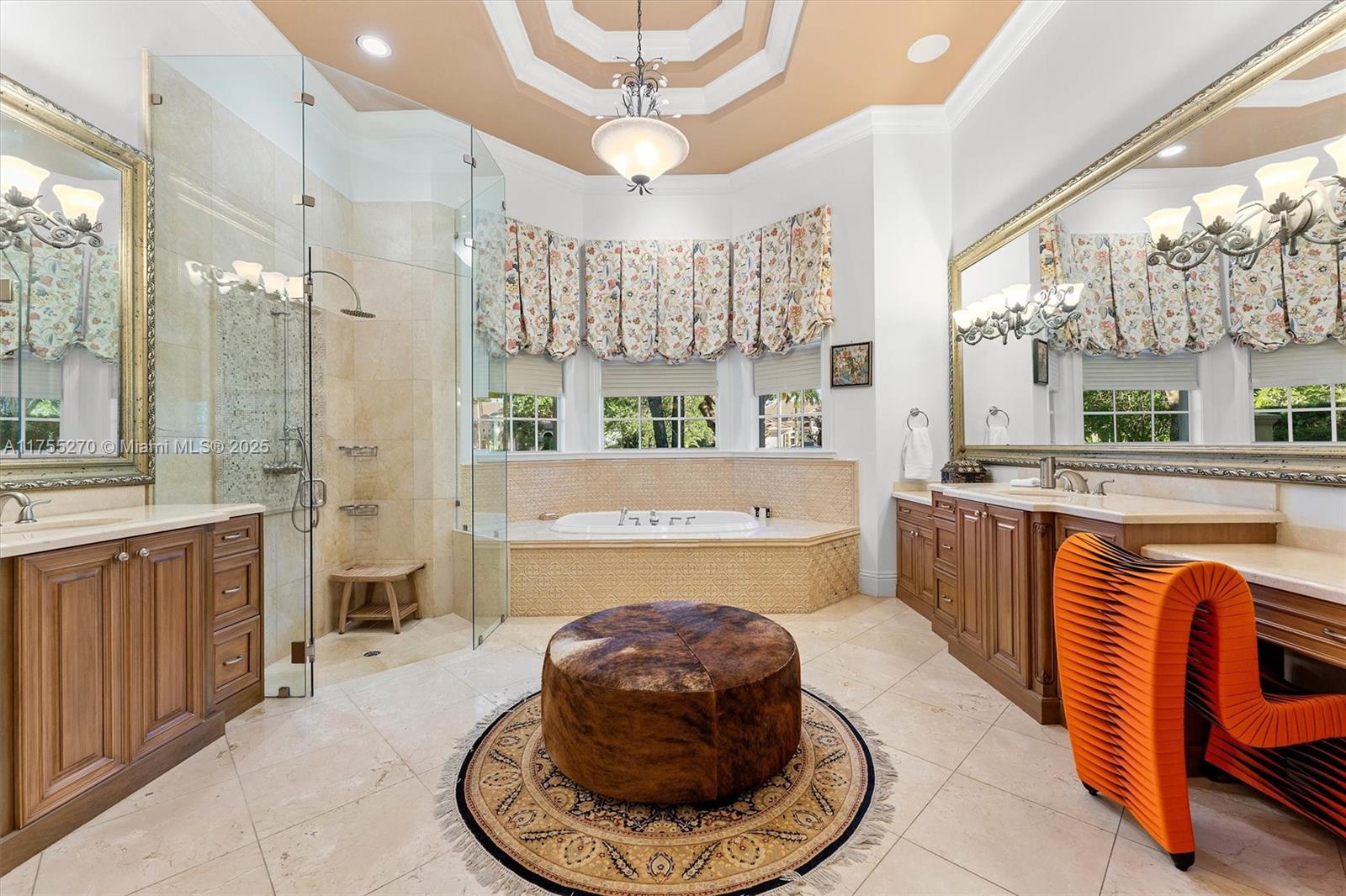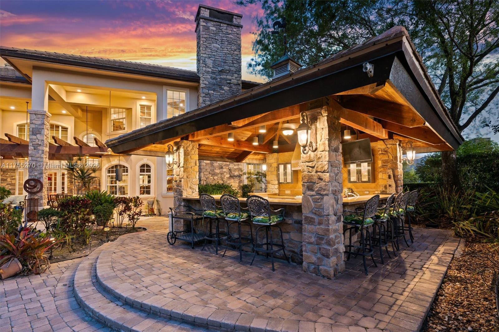 WELCOME TO EXCLUSIVE COMMUNITY OF GRAND OAKS IN DAVIE! This stunning lakefront estate is 1 of 32 custom homes. It offers 5 bedrooms, an office, loft, 5.5 baths and sits on a builder's acre. Enter through soaring 20' ceilings in the foyer, living, and family rooms, both with fireplaces. Enjoy wood, marble, and Jerusalem stone finishes. A custom bistro bar, hand-painted murals, and Chicago brick accents enhance the kitchen and butler's pantry, with a Thermador gas cooktop, grill, and pot filler. The in-law suite has a private entry, private kitchen and cabana bath. The lush, tropical yard boasts mature landscaping, a resort-style pool with a waterfall spa, a summer kitchen, all-impact glass, a 48KW generator with a 1,000-gal tank, and a 250-gal tank for the BBQ, cooktop, and fireplace.