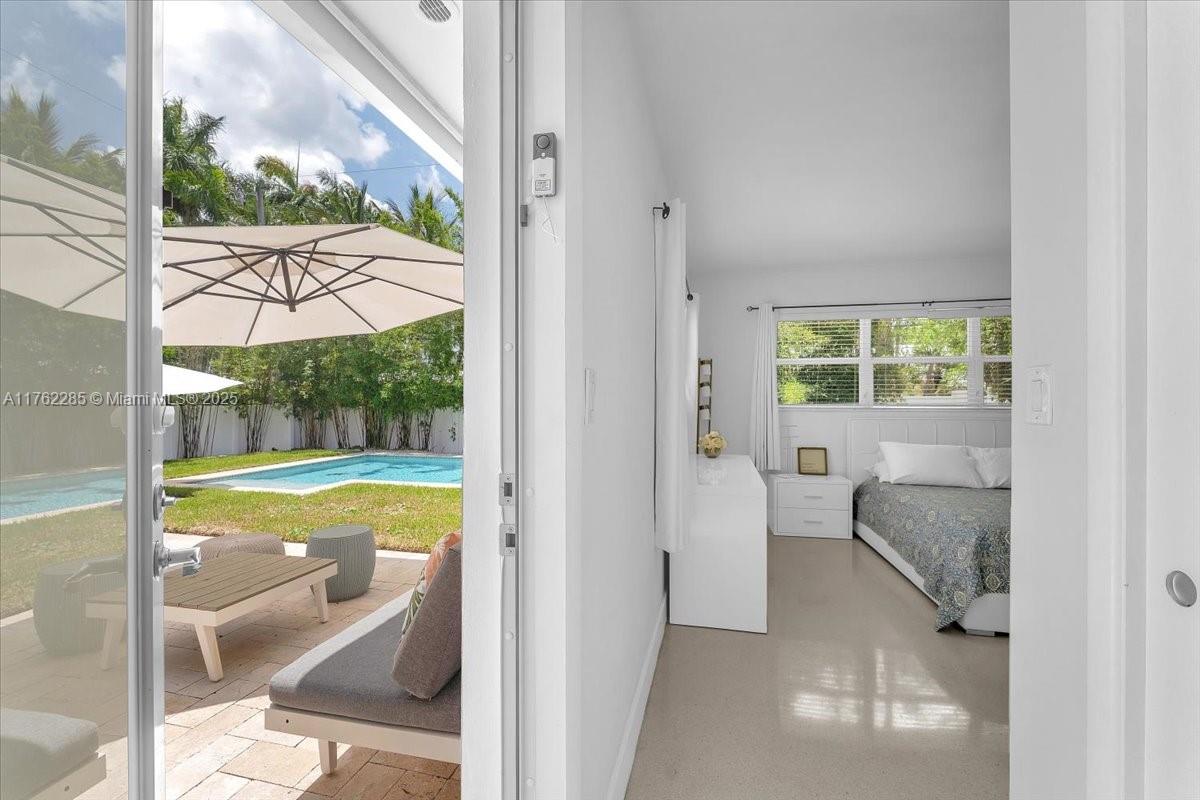 This charming 3-bedroom, 2-bath Mid-Century Modern home is nestled in the highly sought-after Hollywood Lakes neighborhood. Step inside to an open, light filled layout with beautifully maintained terrazzo floors and a split-bedroom floorplan. The bright primary suite opens directly to a peaceful backyard featuring a heated pool, large paved patio, and fenced yard--perfect for relaxing or entertaining. With impact windows/doors, a new roof, and custom built-in closets, and a spacious 2 car garage, this home is move-in ready! Located just minutes from the beach, Hollywood Boardwalk, shopping, dining, and more.