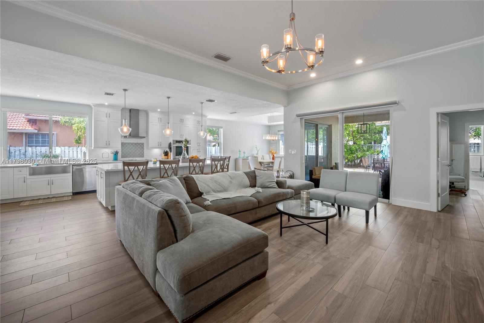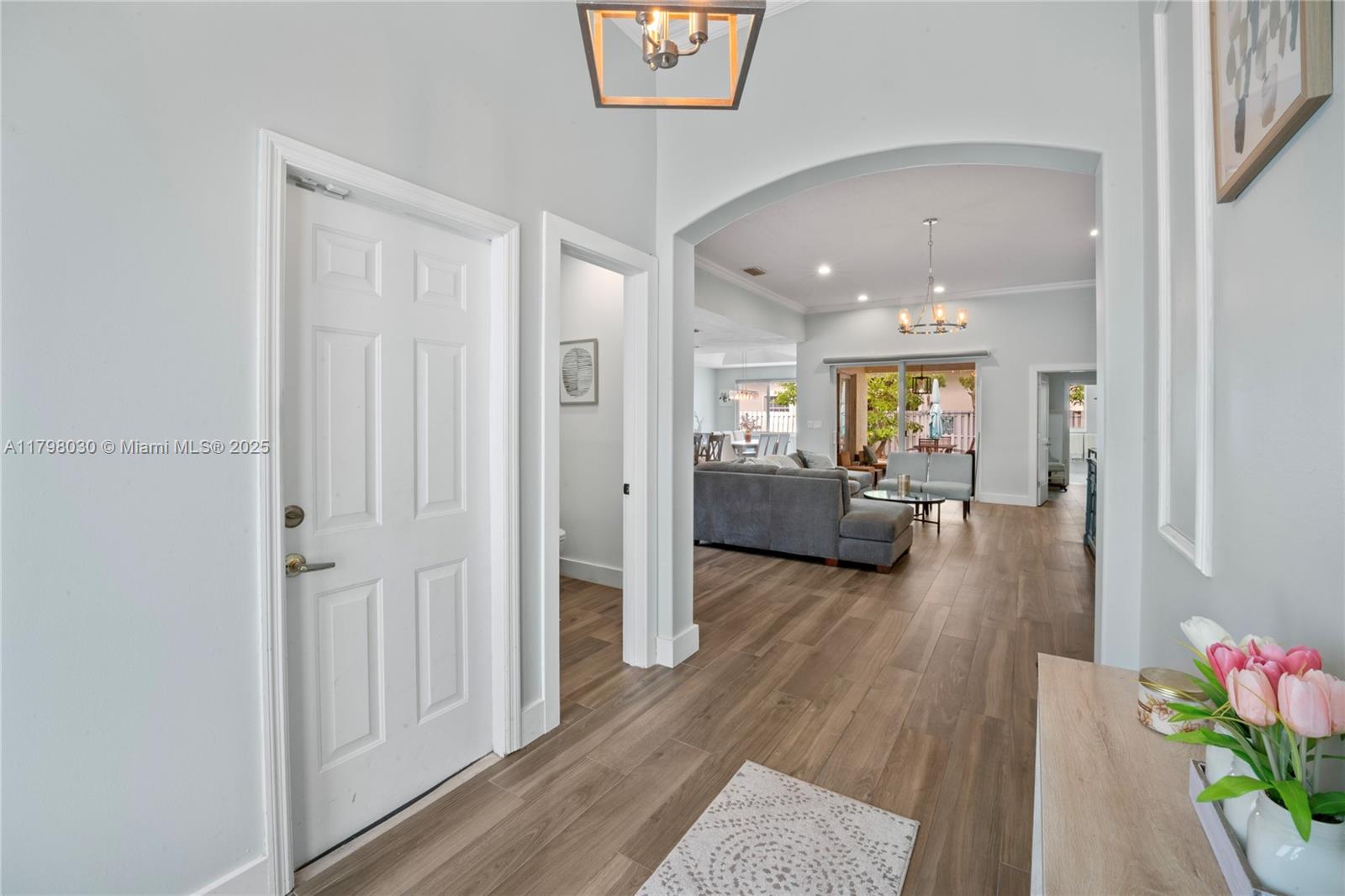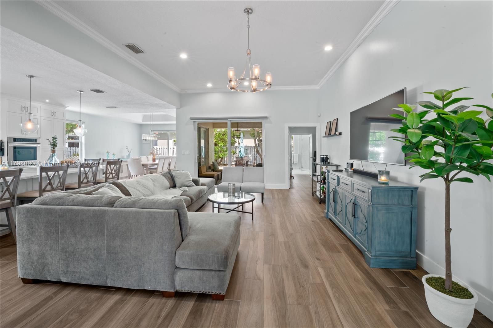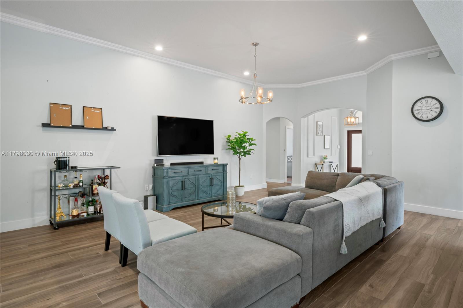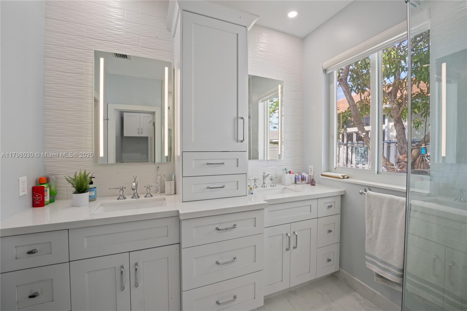 Beautifully renovated pool home featuring 4 bedrooms, 2 full bathrooms, and 2 half bathrooms, including a convenient cabana bath for the pool area. The open-concept layout ideal for entertaining, highlighted by a modern kitchen with a massive quartz island, sleek stainless steel appliances, and an abundance of natural light. The upgraded primary suite offers a luxurious bathroom with an oversized walk-in shower, private toilet room, and custom walk-in closet system. Hurricane-impact windows and doors, a new roof, and attic storage. The backyard is a tropical oasis with a large private pool, spacious patio, lush landscaping, and fruit trees. Ideally located with easy access to I-75, Pines Boulevard, and Miramar Parkway. A gated community with a clubhouse, sports courts, playground.