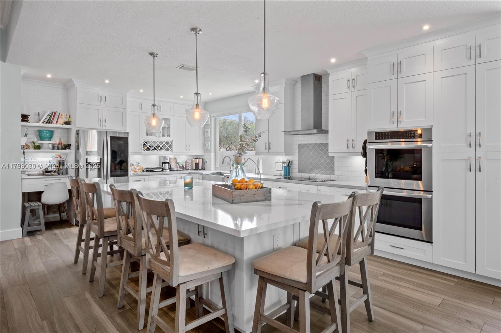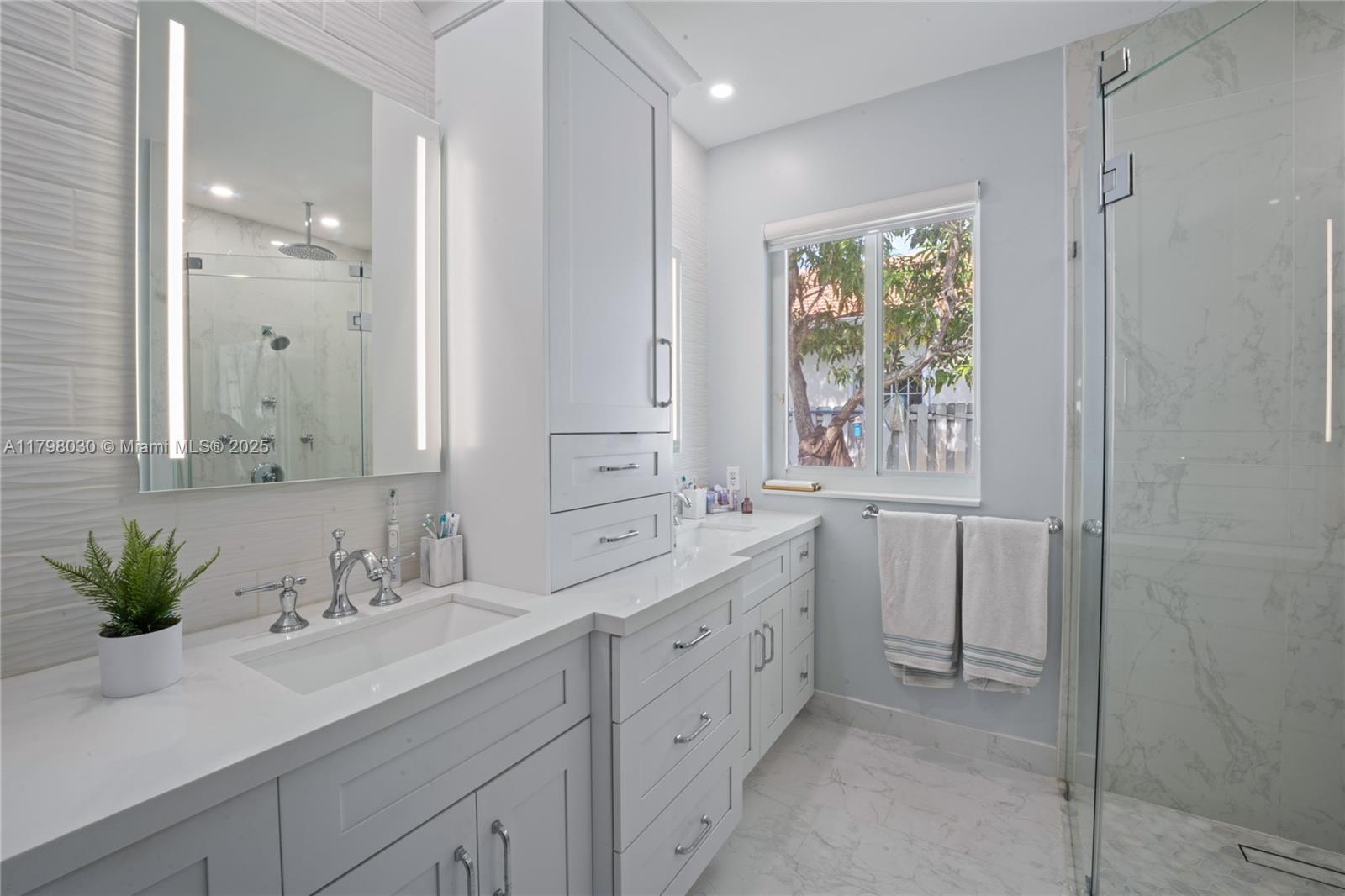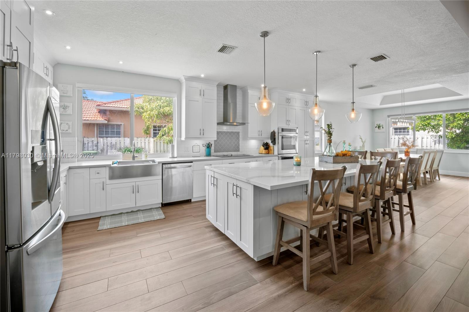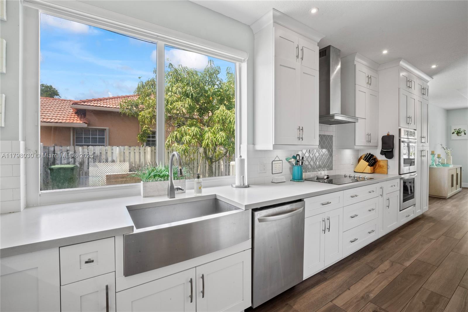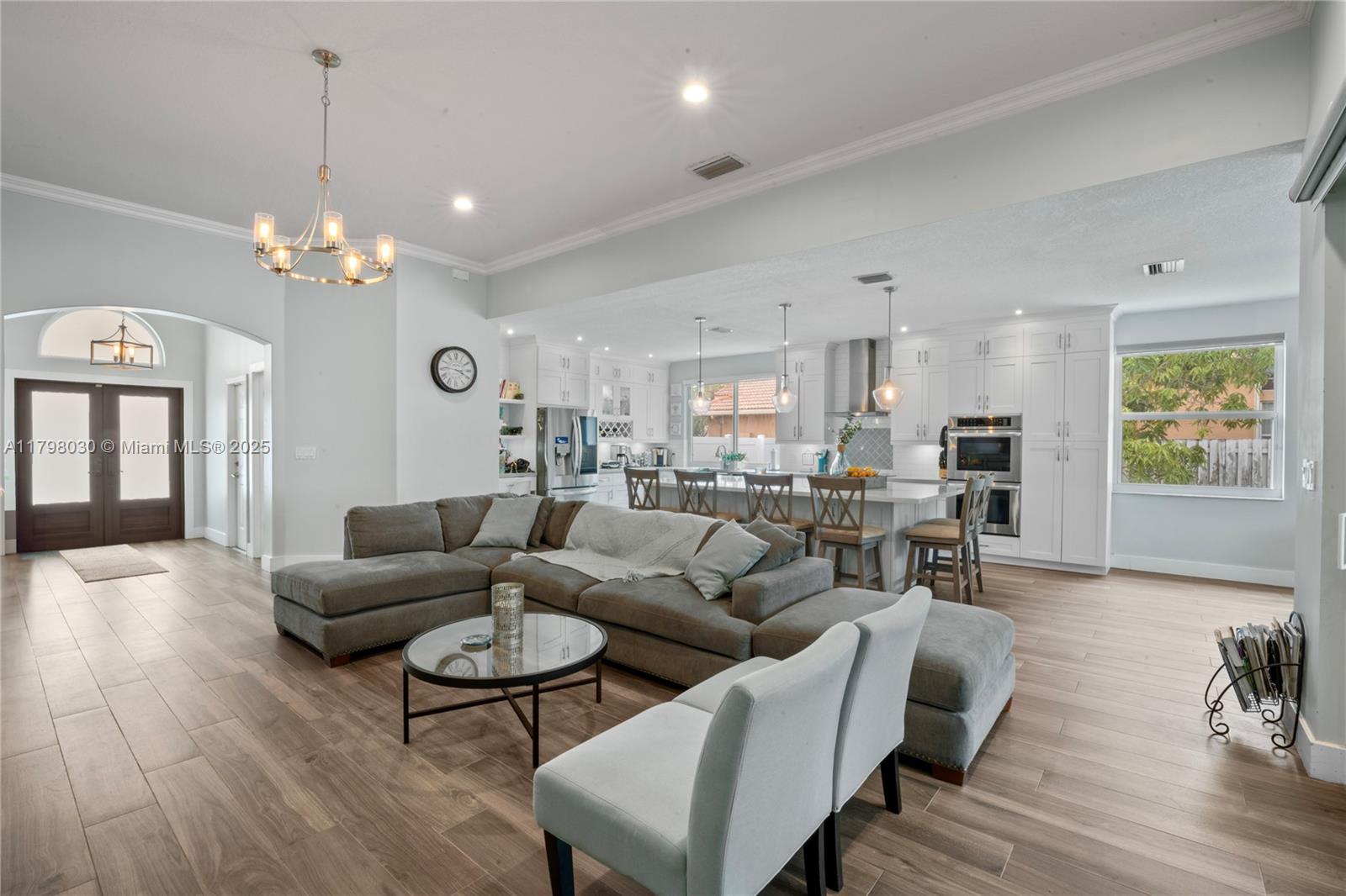 Beautifully renovated pool home featuring 4 bedrooms, 2 full bathrooms, and 2 half bathrooms, including a convenient cabana bath for the pool area. The open-concept layout ideal for entertaining, highlighted by a modern kitchen with a massive quartz island, sleek stainless steel appliances, and an abundance of natural light. The upgraded primary suite offers a luxurious bathroom with an oversized walk-in shower, private toilet room, and custom walk-in closet system. Hurricane-impact windows and doors, a new roof, and attic storage. The backyard is a tropical oasis with a large private pool, spacious patio, lush landscaping, and fruit trees. Ideally located with easy access to I-75, Pines Boulevard, and Miramar Parkway. A gated community with a clubhouse, sports courts, playground.
