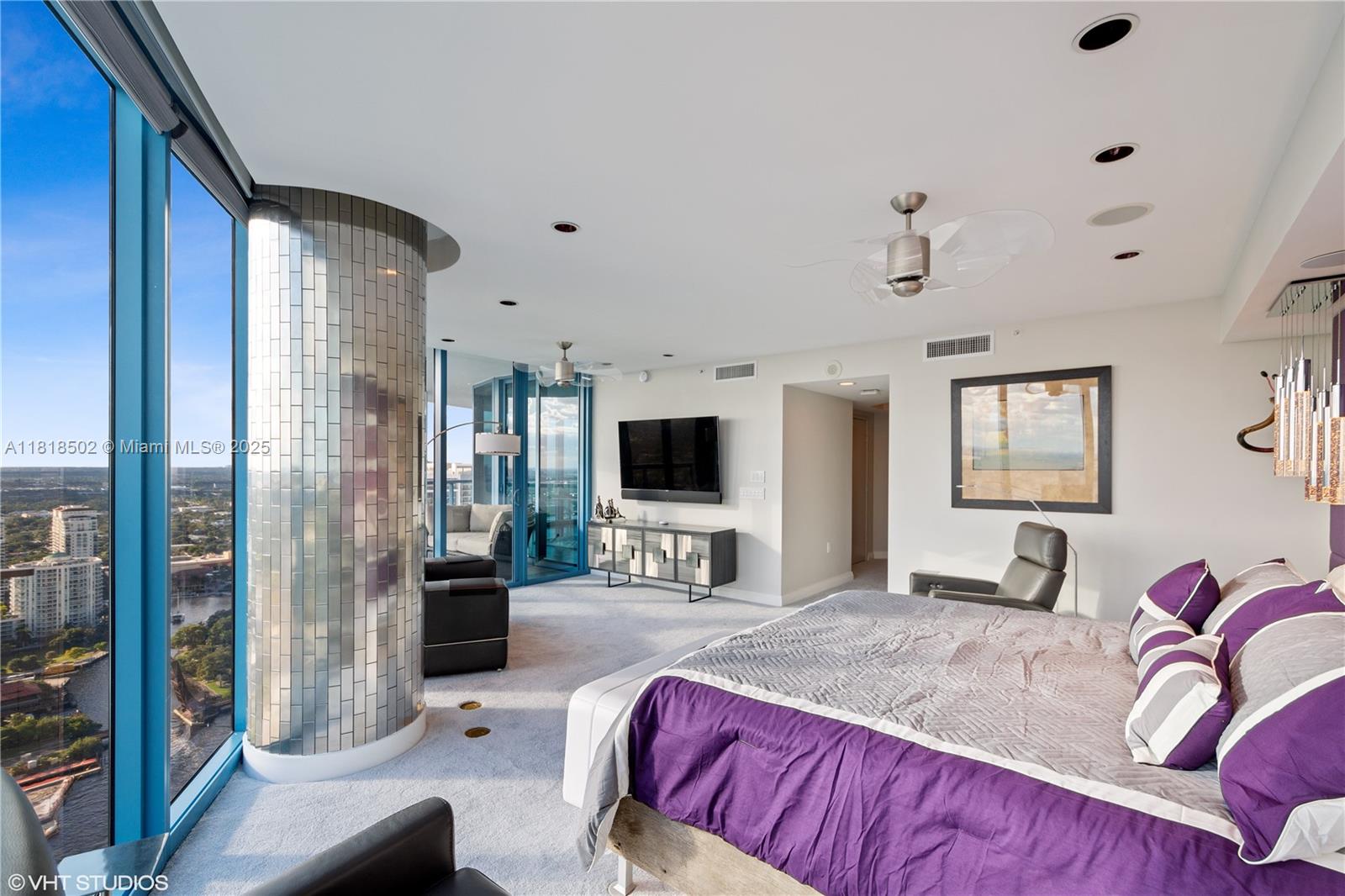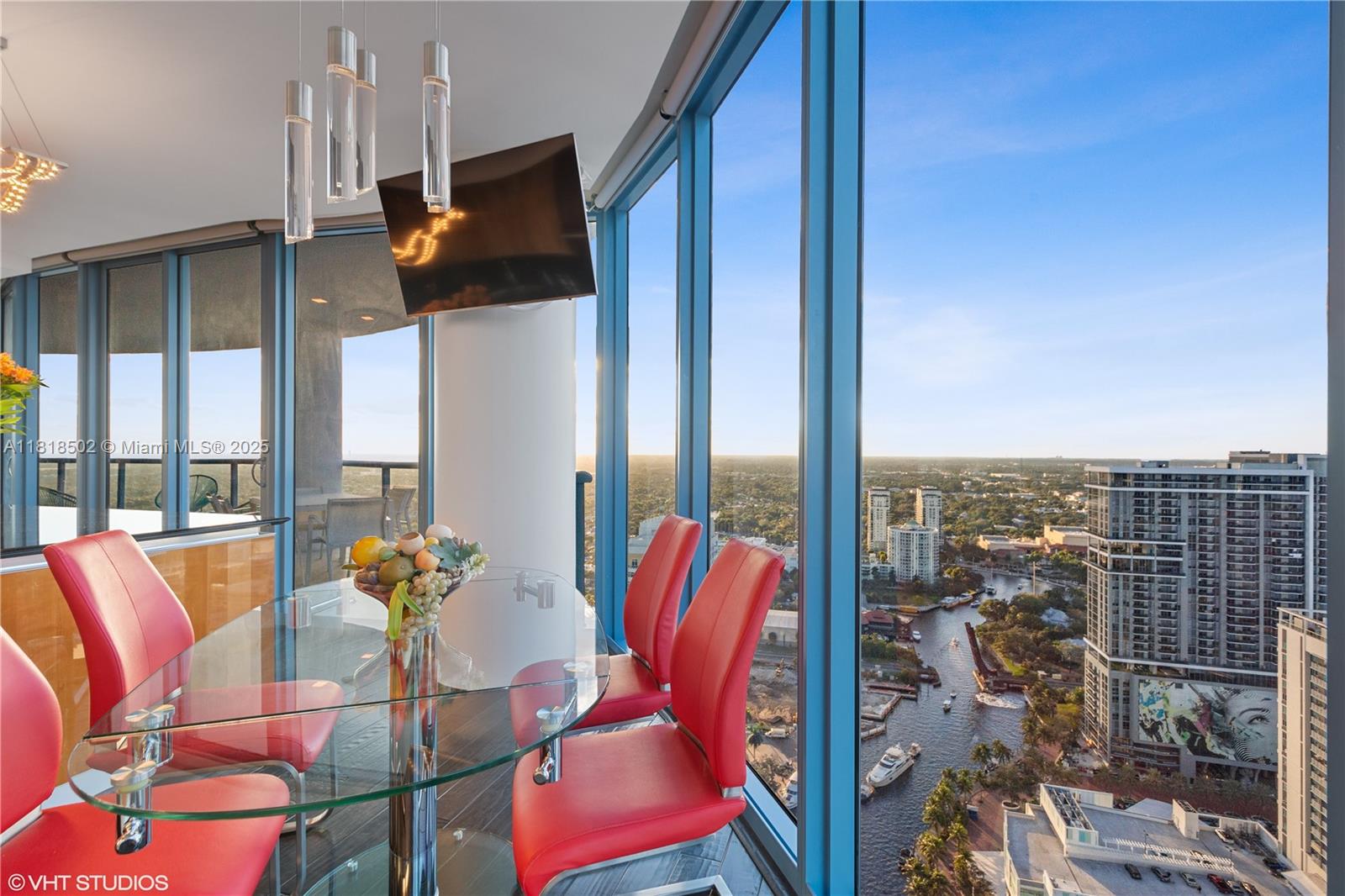 Beautifully furnished 3/3.5 - 39th floor Madison at the Las Olas River House. 270 degree panoramic views of the ocean, city skyline and New River. Sunrise & Sunsets. Private elevators takes you to your own foyer with double door entry into this 5 star premier condo in downtown Ft Lauderdale's landmark tower. Floor to ceiling glass, sweeping wrap around balcony, split floor plan, open living space with bar, huge kitchen, full custom electronic, A/V, shades & more. Amenities Galore! River House offers luxury urban living in the heart of Las Olas Blvd on the New River. Walk to the best restaurants including Eddie V's just down the block along with GreenWise Market and Hyatt Hotel. 24 hr valet, front desk, concierge, fitness center and tropical pool deck with all day sun. Dynamic urban life!