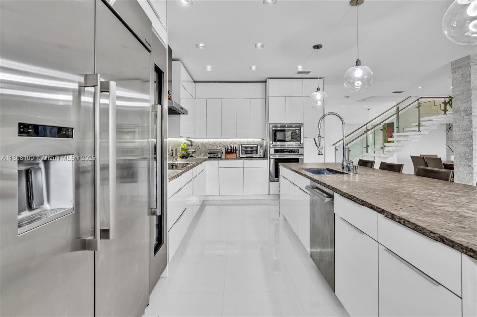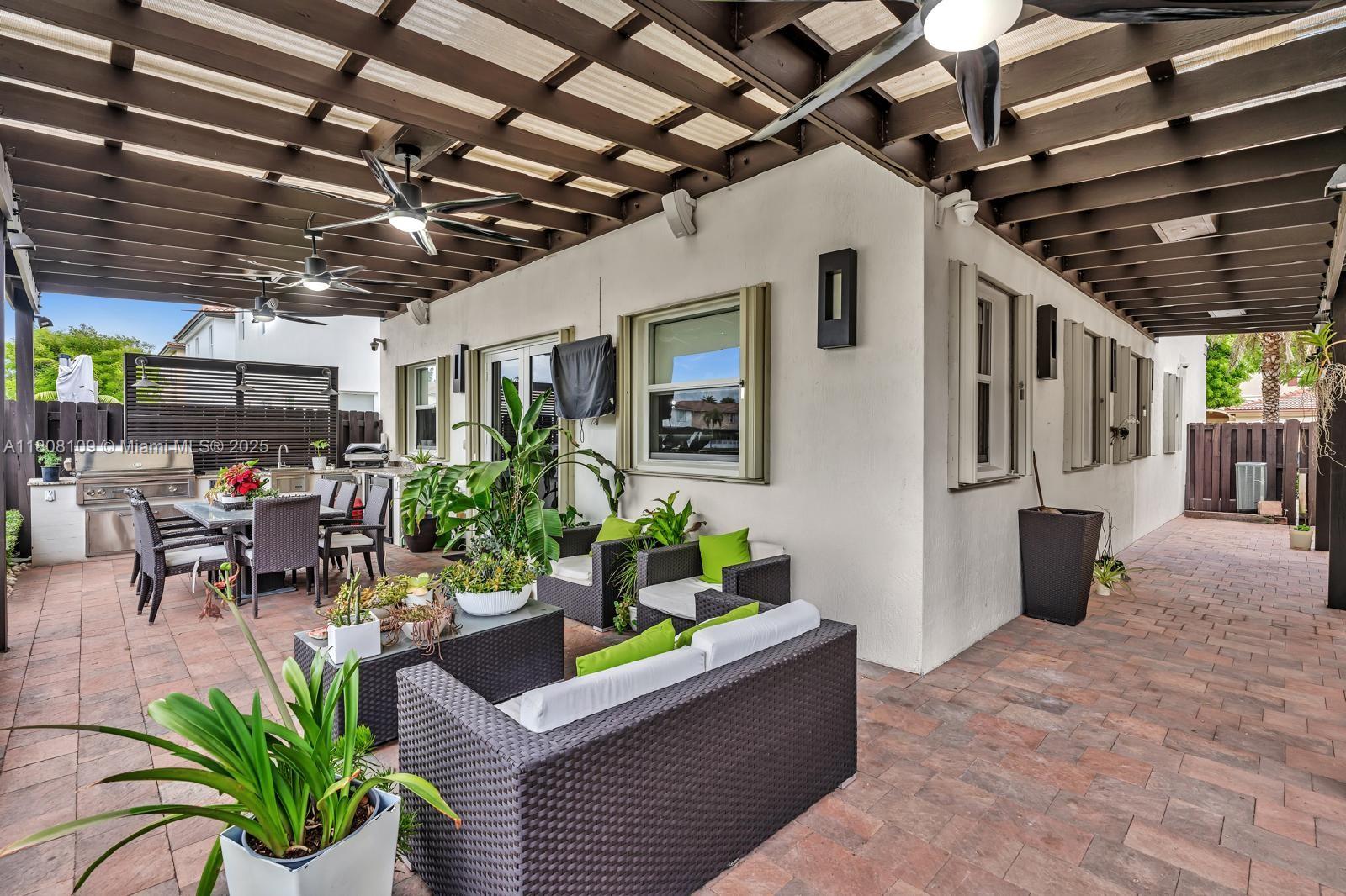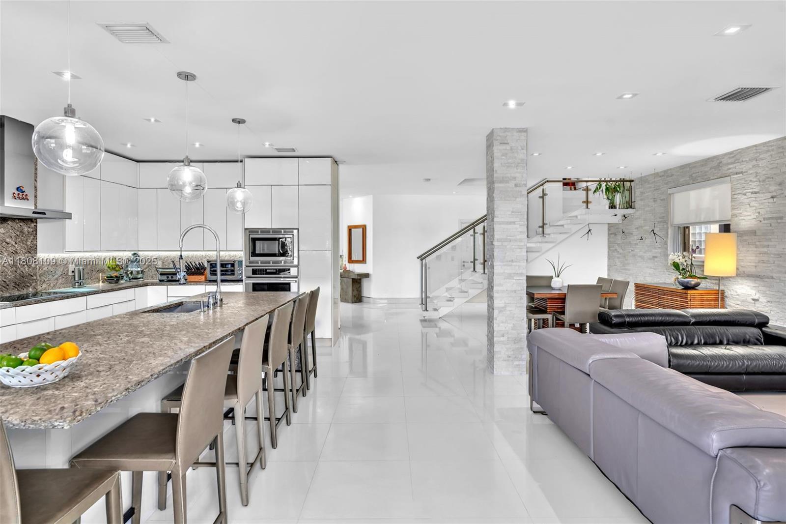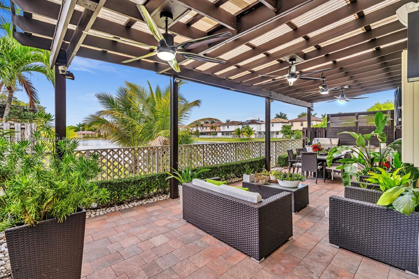 LOCATION! Live in the heart of Doral in this fully remodeled 4-bedroom, 2.5-bath home featuring spectacular design throughout. Enjoy hosting gatherings around the 13-foot natural stone island. Enjoy the sunset and lake view from the covered patio with a surrounding pergola. Every space has been tastefully designed with both style & functionality in mind. Kitchen is equipped w/ Thermador appliances, w/ a wine cooler 73-bottle capacity. The open layout, enhanced by a custom floating staircase, gives the living and dining areas a bright and spacious feel. The large master bedroom features a spacious bathroom with an oversized shower. All custom-designed California closets. Low HOA, Aprox $200K in upgrades.