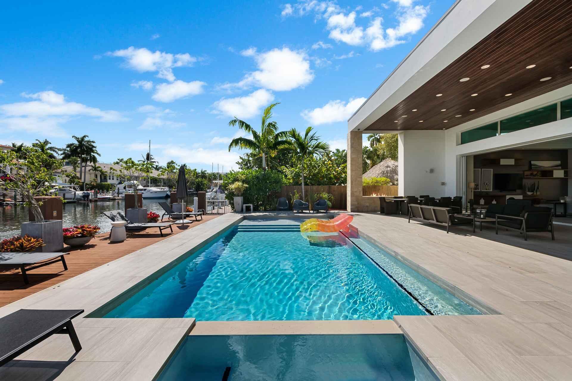 New co-ownership opportunity: Own one-eighth of this professionally managed, turnkey home by Pacaso. Take your pick: Stroll through the front gate and lush courtyard, or moor your boat at the private dock. This modern waterfront home features 5 bedrooms, 4.5 bathrooms and an open floor plan with a window-lined great room that opens to a covered deck, pool and spa. The sleek kitchen includes high-end appliances, a large island and a breakfast nook with built-in workstation. The main-level suite offers a walk-in closet, spa-style bathroom and patio access. Upstairs are four additional bedroom suites and a sitting area. The home, located near Las Olas shopping and dining, comes fully furnished and professionally decorated.