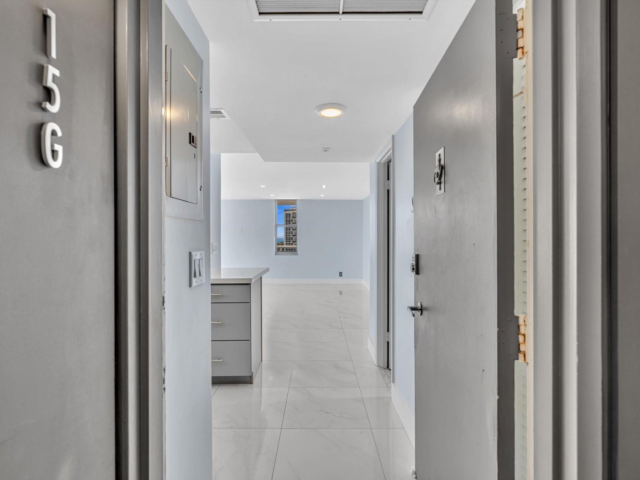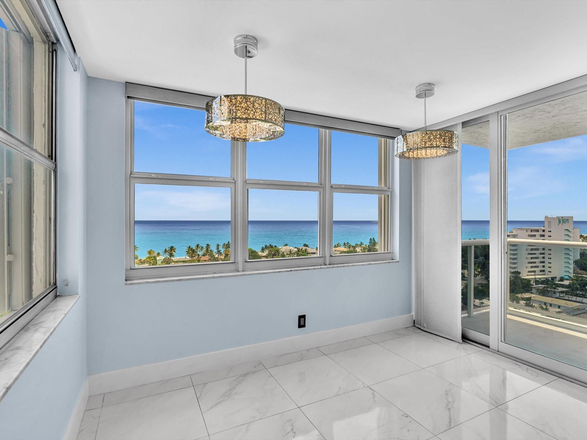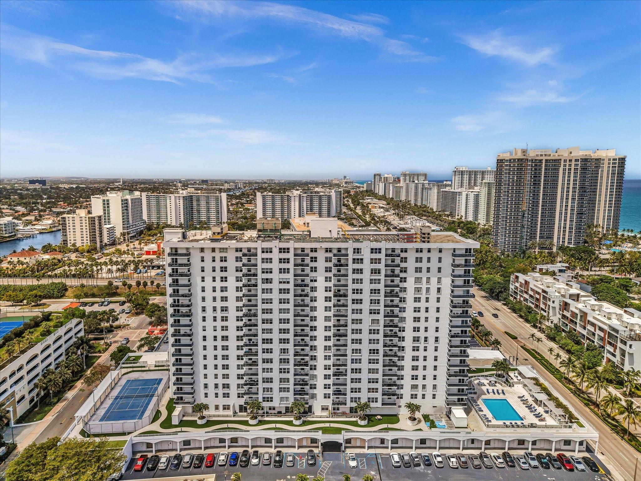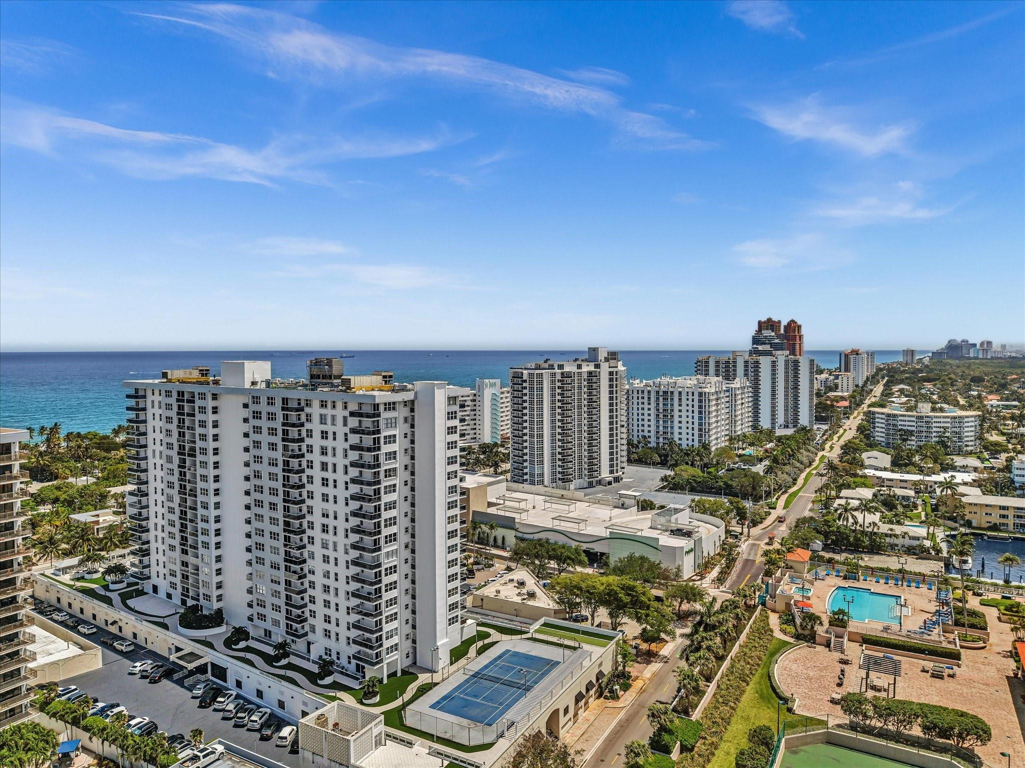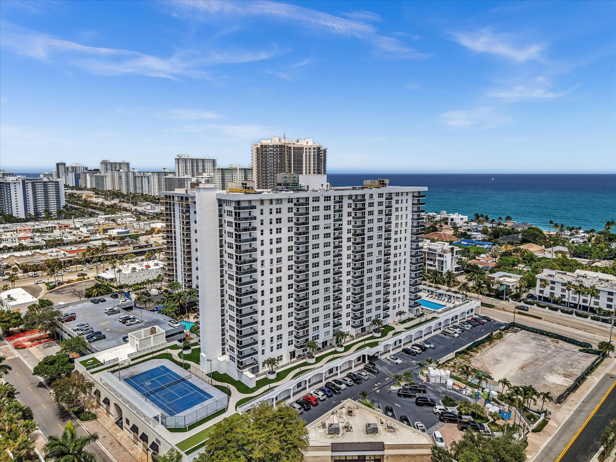 Experience Breathtaking Ocean, Intracoastal, and City views from this 2-bedroom, 2-bath SE Corner 15th floor in Luxury Building. Featuring a sleek modern kitchen with gray shaker cabinets, quartz countertops, glass mosaic backsplash, and stainless steel appliances. This bright, over 1328 Square foot unit includes 1 assigned parking spot and a private storage unit. Building has completed 50 year Recertification , 2025 New Roof, recently remodeled pool, green walkway, updated gym and hallways. Walk Across the street to the New Publix, down the street restaurants and the beach. Seller has contracted for new impact windows to be installed! HOA fee includes, water, sewer, trash pick up, basic cable, high speed internet, pest control. Laundry facility on each floor. Bike storage in the garage.