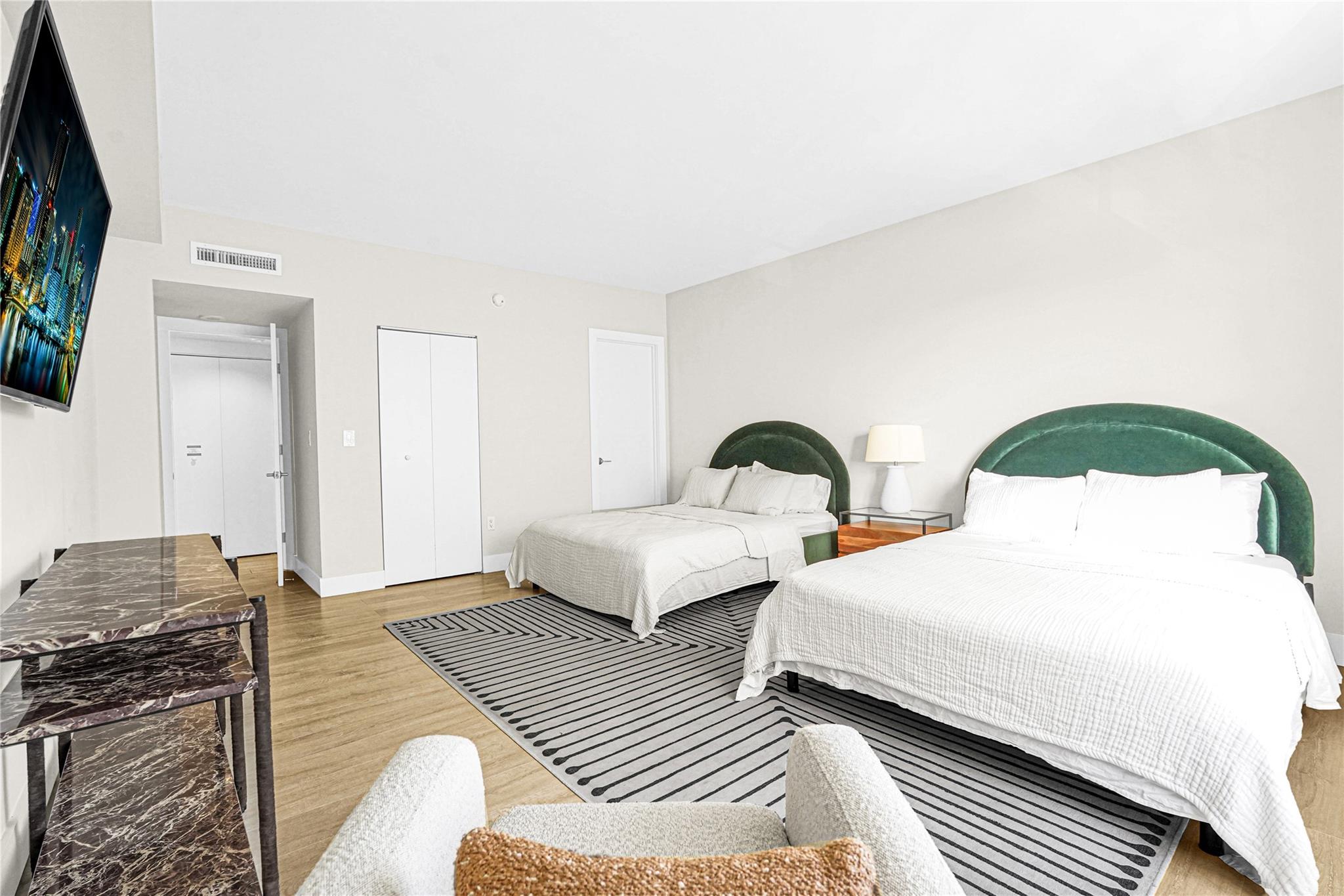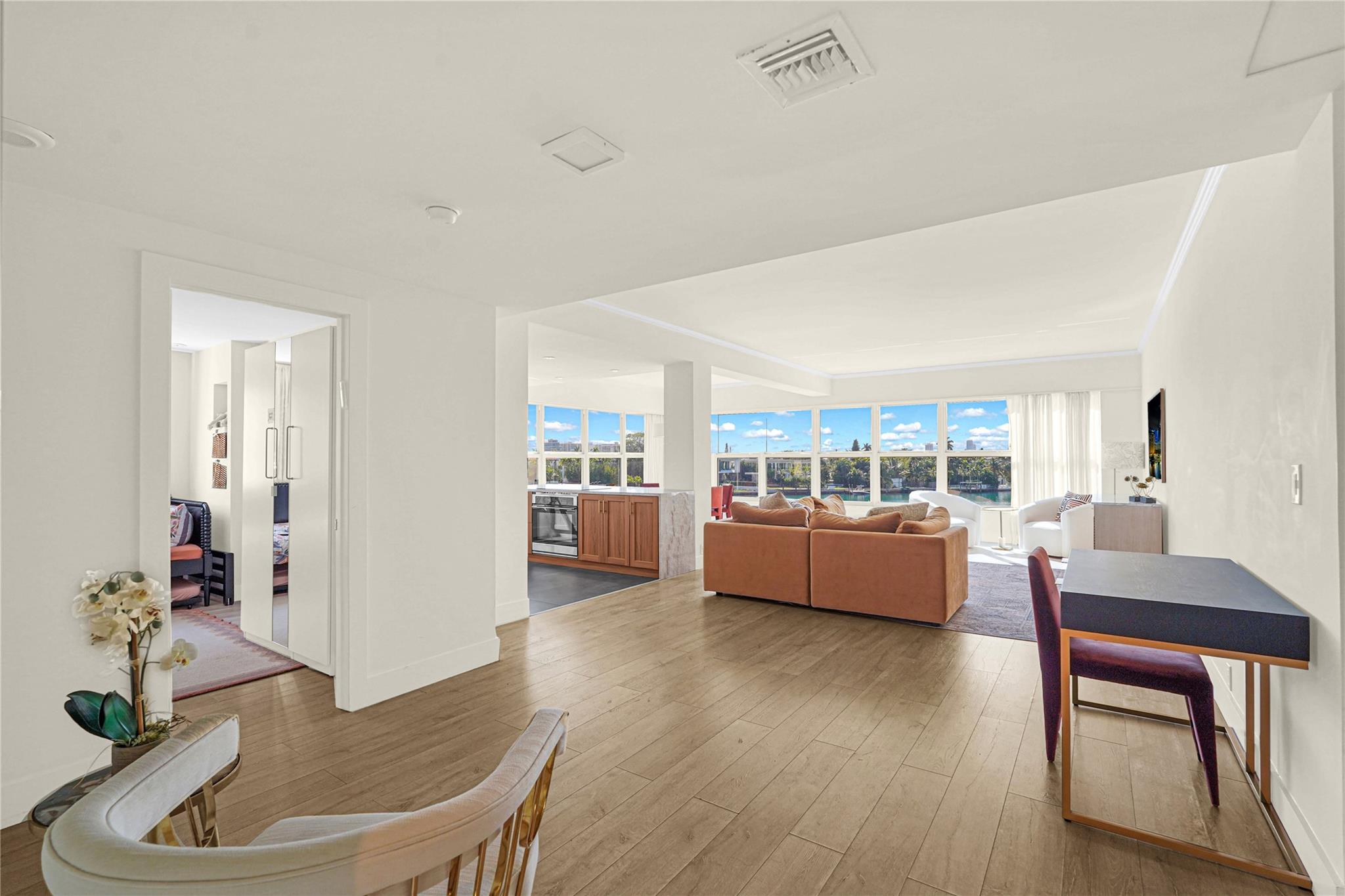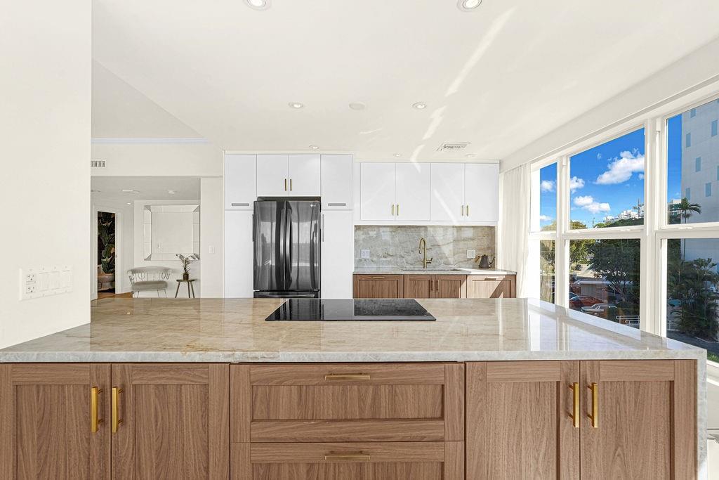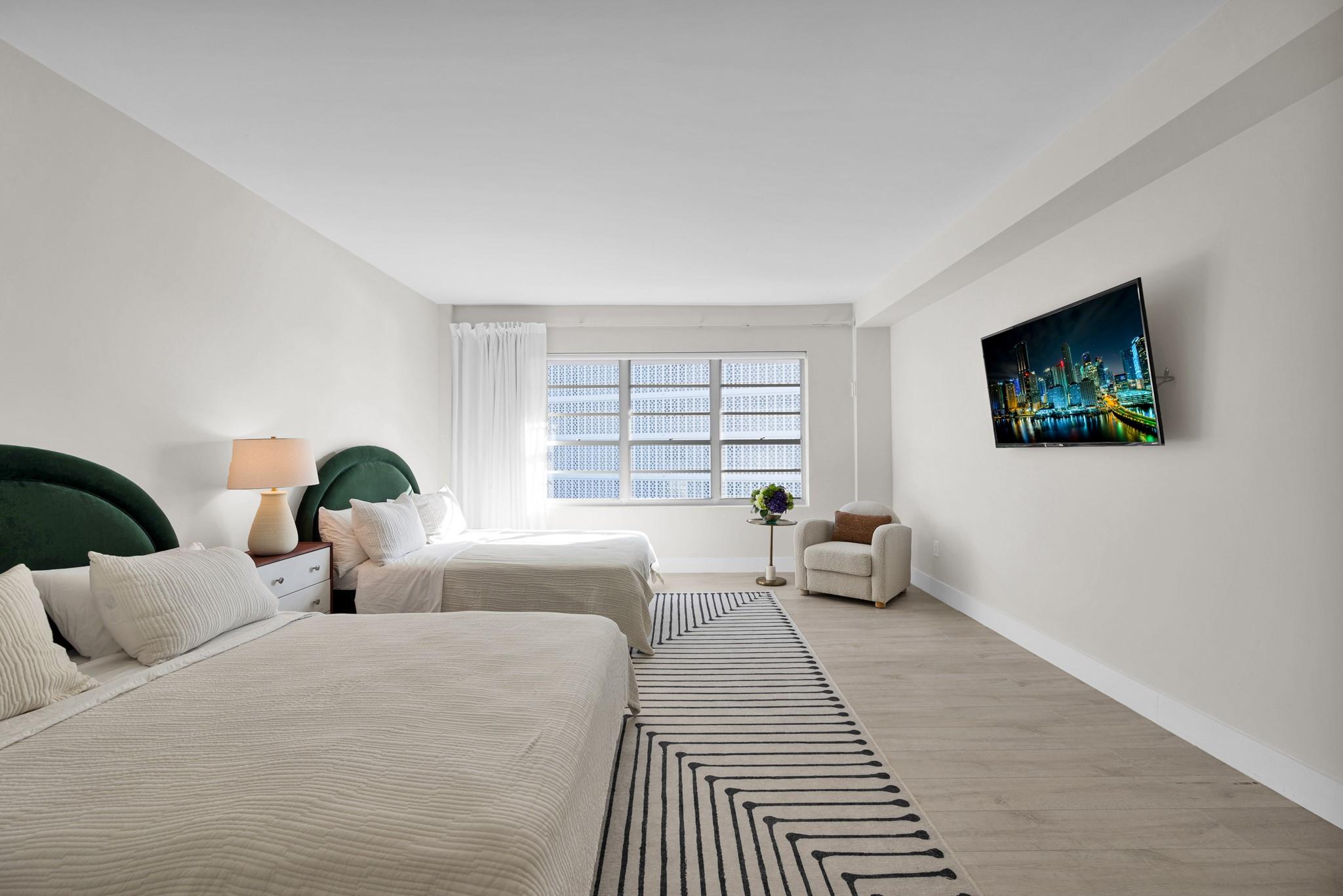 Radiant water/sky-line/golf course views from this 1,770 SF 3BD/3BA unit at Blair House, a waterfront icon on the southernmost point of the island. Wide open floor plan, showered w/ natural light; 9' ceilings; fully redone. Designed by Herbert Matthes in 1959 (Fontainebleau/Standard Hotels) Blair House exemplifies MiMo architecture at its finest, exuding the glamour/fun of the era. Owners are modernizing/moving building forward functionally while sustaining its heritage & creative integrity. Walkability score=10 Steps to worship houses, kid/dog parks, beach, business districts, Bal Harbour Shops, A-rating public school.